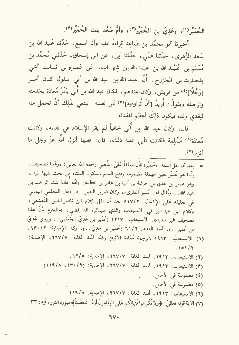 أخبرنا أبو مُحمَّد بن صَاعِد , قراءةً عليه وأنا أسمع , حَدَّثَنا عُبَيْد الله بن سَعْد الزُّهْريّ , حَدَّثَنا عمي , حَدَّثَنا أبي، عن ابن إِسْحَاق , حَدَّثني مُحمَّد بن مسلم بن عُبَيْد الله بن عَبد الله بن شهاب , عن عَمْرو بن ثابت أخي بلحارث بن الخزرج: أن عَبد الله بن عَبد الله بن أبي سلول كان أسر رجلا من قُرَيْش , وكان عندهم فكان عَبد الله بن أُبَيّ يأمر معاذة بخدمته وترجيله ويقول: أريد أن تراوديه , عن نفسه. يبتغي بذلك أن تحمل منه ليفدي ولده فيكون ذلك أعظم للفداء.