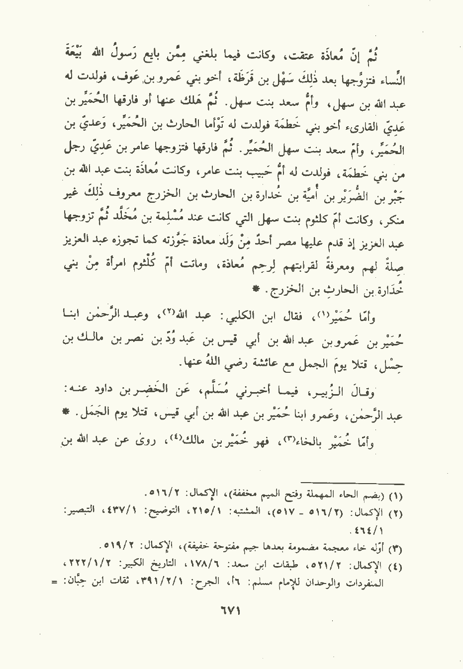 وأمَّا حُمَيْر فقال ابنُ الكَلْبي: عَبد الله , وعبد الرَّحْمن ابنا حُمَيْر بن عَمْرو بن عَبد الله بن أبي قيس بن عبد ود بن نصر بن مالك بن حسل قتلا يوم الجمل مع عائشة رضي الله عنها.