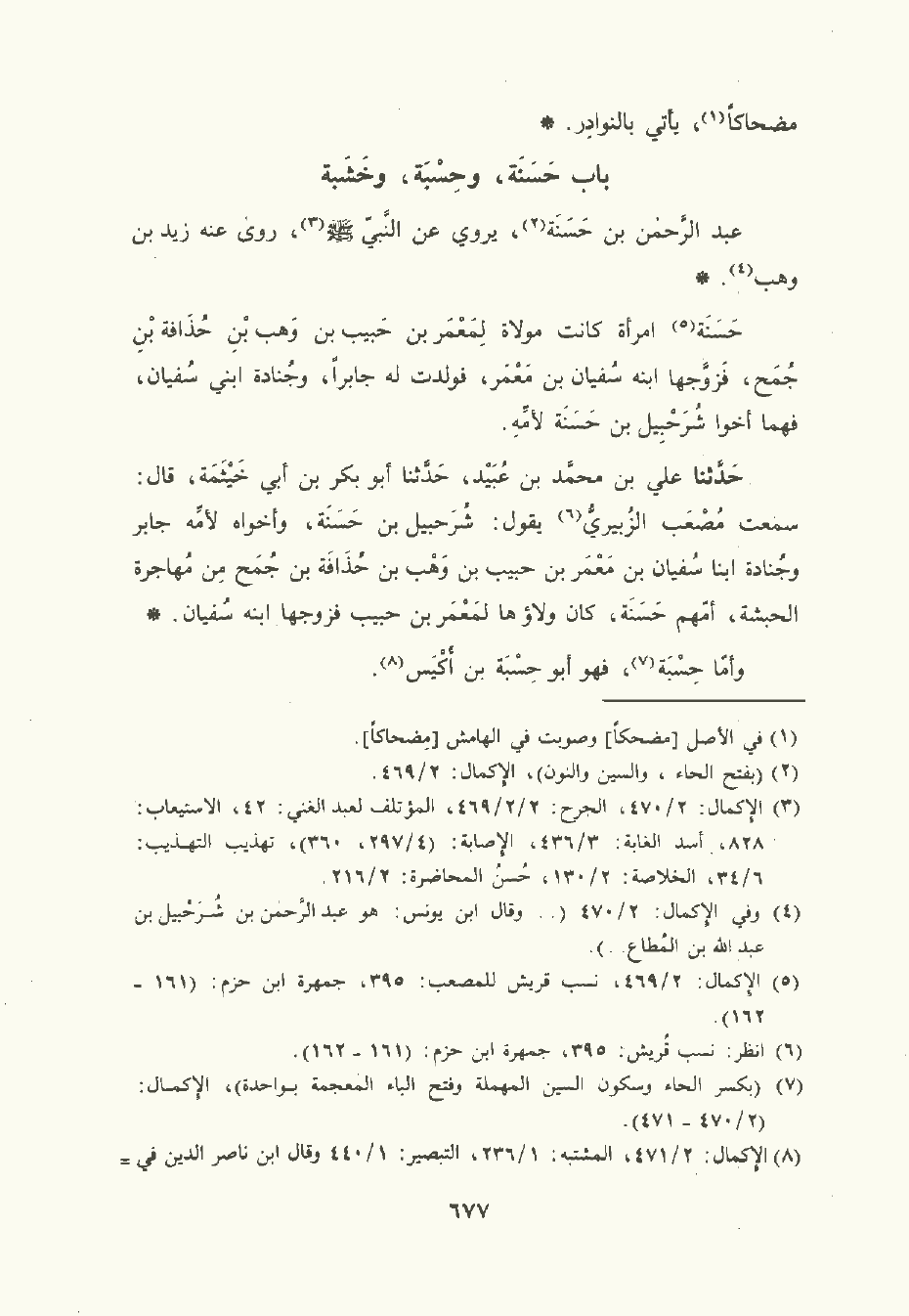 حَدَّثَنا علي بن مُحمَّد بن عبيد , حَدَّثَنا أبو بكر بن أبي خَيْثَمة قال: سَمِعتُ مصعب الزُّبَيْريّ يقول: شُرَحْبِيل بن حسنة وأخواه لأمه جابر وجنادة ابنا سُفْيان بن معمر بن حبيب بن وَهْب بن حذافة بن جمح من مهاجرة الحبشة أمهم حسنة كان ولاؤها لمعمر بن حبيب فزوجها ابنه سُفْيان.