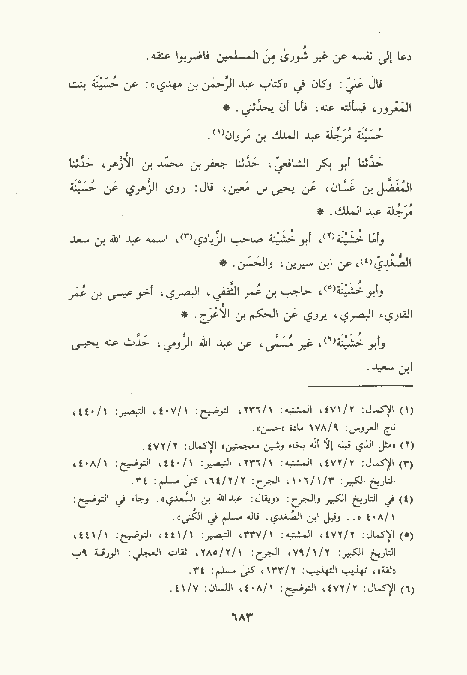 حَدَّثَنا أبو بكر الشَّافِعيّ , حَدَّثَنا جَعْفر بن مُحمَّد بن الأَزْهر , حَدَّثَنا المفضل بن غسان , عن يَحْيى بن مَعِين قال: روى الزُّهْريّ , عن حُسَيْنَة مرجلة عبد الملك.