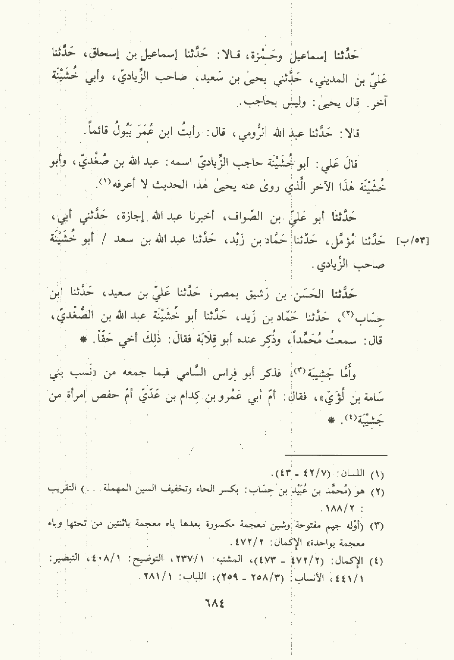 حَدَّثَنا إِسْمَاعِيل وحمزة قالا: حَدَّثَنا إِسْمَاعِيل بن إِسْحَاق , حَدَّثَنا عَلِيّ بن المَدِينيّ , حَدَّثني يَحْيى بن سَعِيد صاحب الزيادي، وَأَبي خُشَيْنَة آخر. قال يَحْيى: وليس بحاجب.