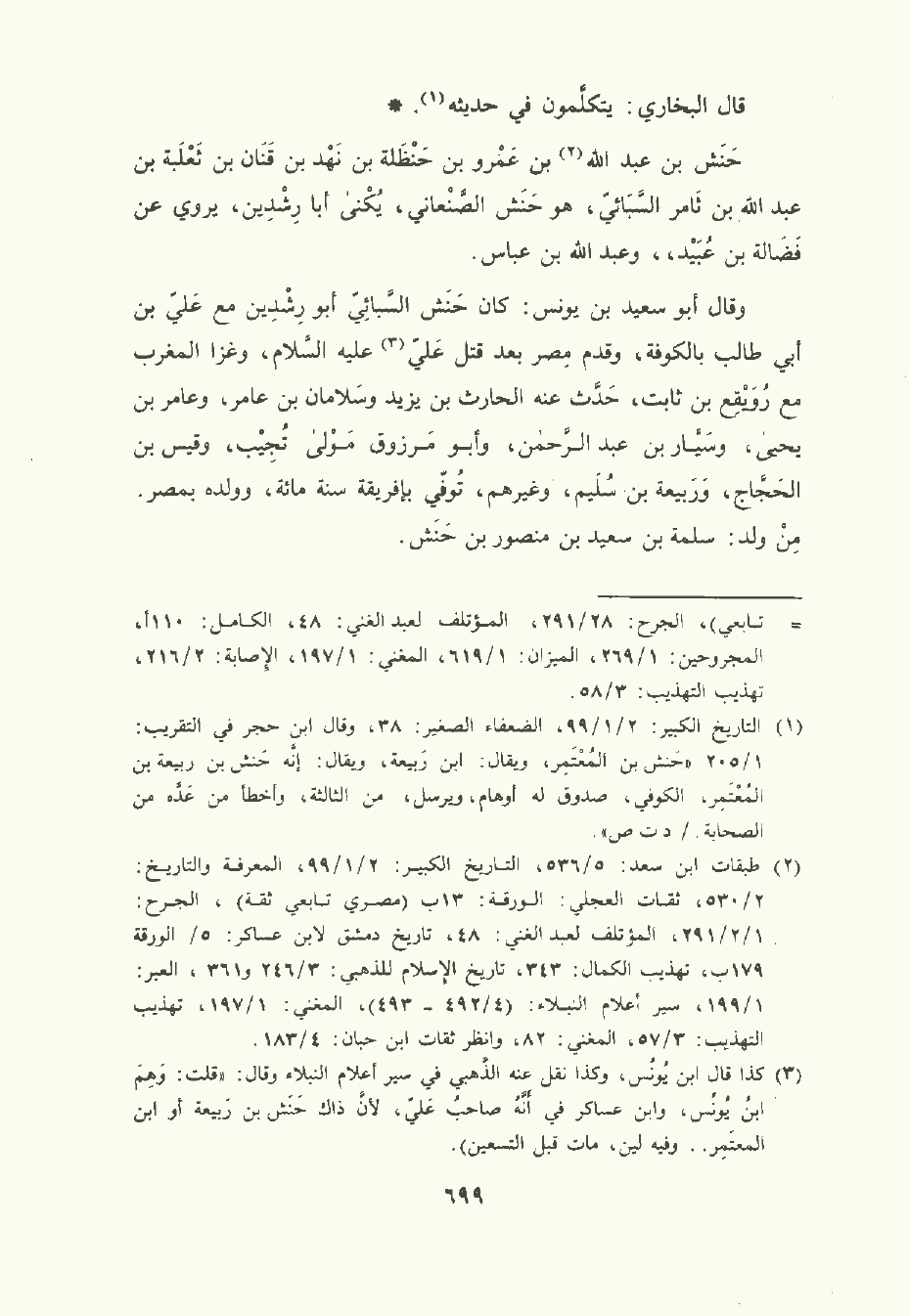 حَنَش بن عَبد الله بن عَمْرو بن حَنْظَلة بن نهد بن قنان بن ثَعْلَبة بن عَبد الله بن ثامر السبائي هو حَنَش الصَّنْعَانِيّ يُكْنَى أبا رشدين , يَرْوي عن فضالة بن عبيد , وعَبد الله بن عَبَّاس.
