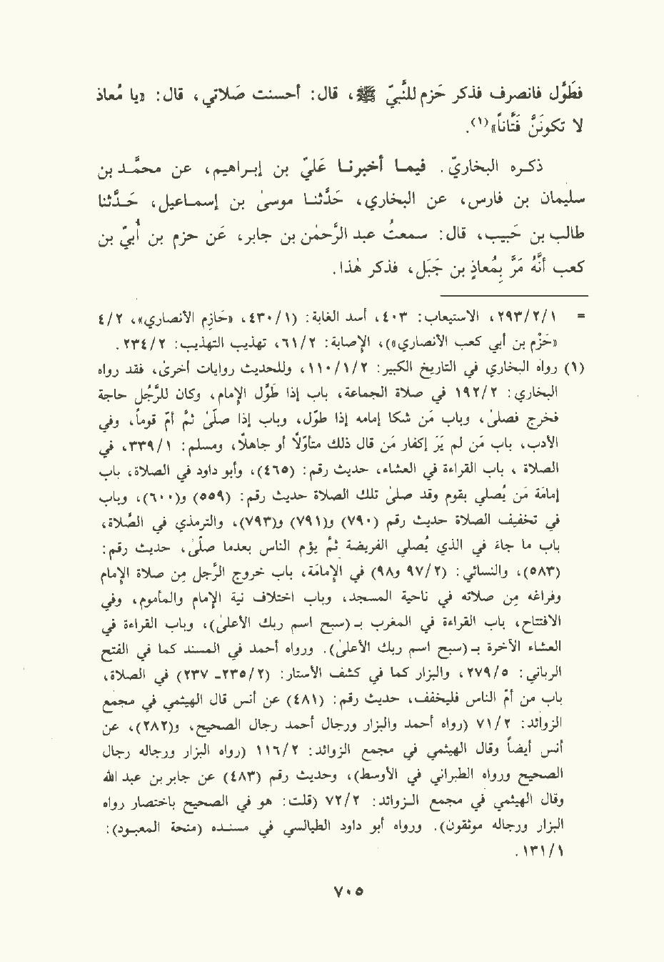 ذكره البُخَاريّ. فيما أخبرنا علي بن إبراهيم , عن مُحمَّد بن سُلَيْمان بن فارس , عن البُخَاريّ , حَدَّثَنا موسى بن إِسْمَاعِيل , حَدَّثَنا طالب بن حبيب قال: سَمِعتُ عبد الرَّحْمن بن جابر , عن حَزْم بن أُبَيّ بن كَعْب أنه مر بمُعَاذ بن جبل فذكر هذا.