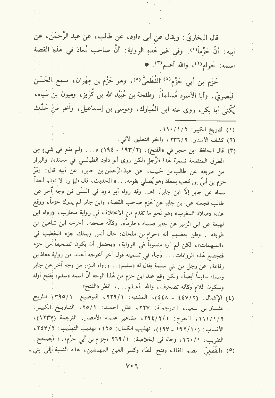 قال البُخَاريُّ: ويقال، عن أبي داود , عن طالب، عن عَبد الرَّحْمن , عن أبيه: أن حزما. وفي غير هذه الرواية: أن صاحب معاذ في هذه القصة اسمه: حرام والله أعلم.