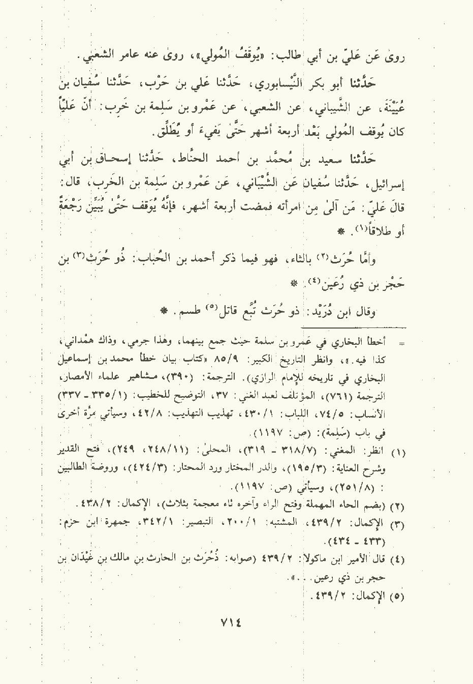 حَدَّثَنا أبو بكر النَّيْسَابوري , حَدَّثَنا علي بن حَرْب , حَدَّثَنا سُفْيان بن عُيَيْنَة , عن الشَّيْبانِيّ , عن الشَّعْبيّ , عن عَمْرو بن سلمة بن خَرِب: أن عليا كان يوقف المولي بعد أربعة أشهر حتى يفيء أو يطلق.
