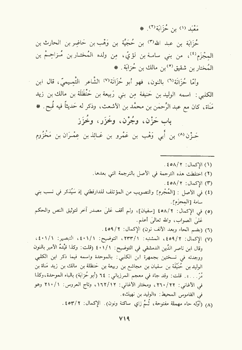 وأمَّا حُزَانَة بالنون , فهو أبو حُزَانَة الشَّاعِر التَّمِيميّ قال ابنُ الكَلْبي: اسمه الوليد بن حنيفة من بني ربيعة بن حَنْظَلة بن مالك بن زيد مناة كان مع عبد الرَّحْمن بن مُحمَّد بن الأشعث وذكر له حديثا فيه قبح.