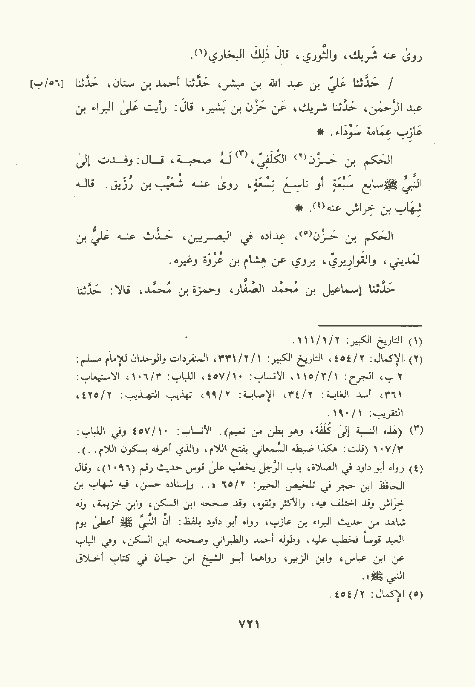 الحكم بن حزن الكلفي , له صُحْبة قال: وفدت إلى النَّبِيّ صلى الله عليه وسلم سابع سبعة أو تاسع تسعة، رَوَى عنه شُعَيْب بن رزيق , قاله شهاب بن خراش عنه.