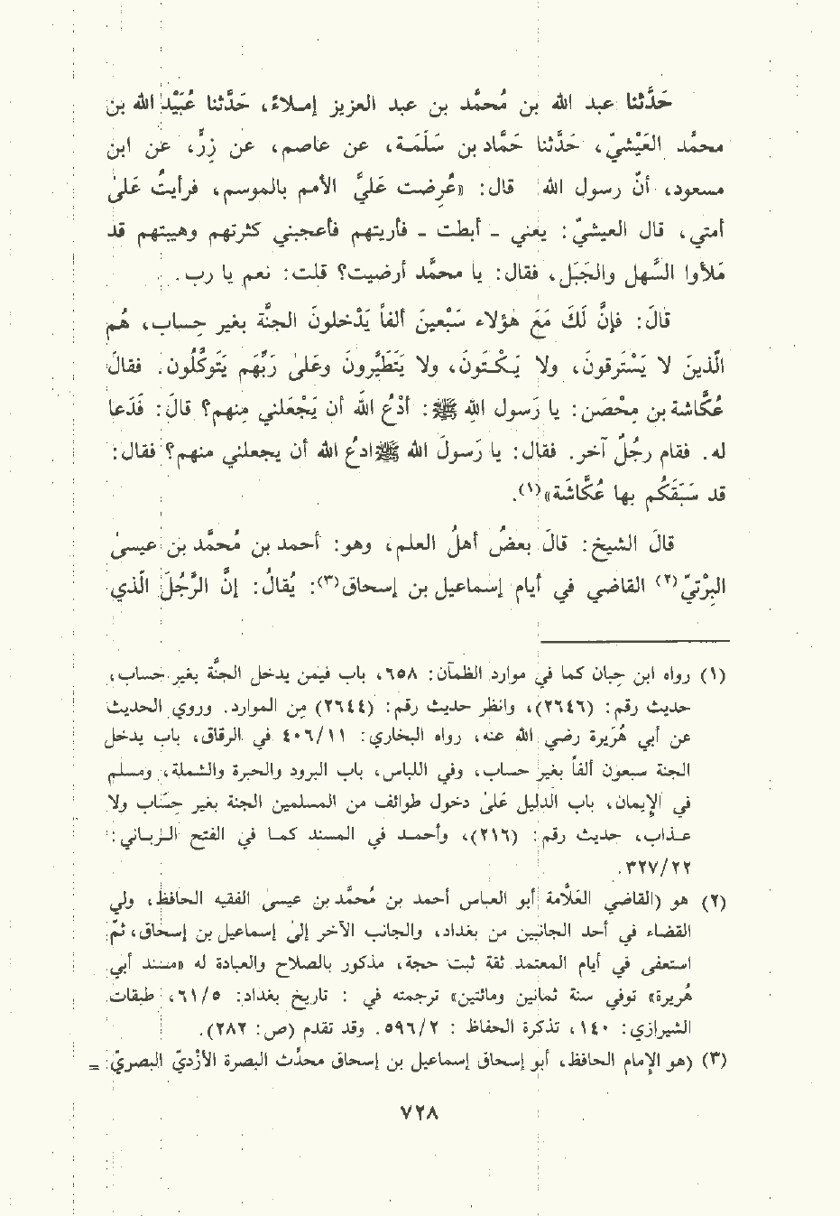 حَدَّثَنا عَبد الله بن مُحمَّد بن عبد العزيز إملاء , حَدَّثَنا عُبَيْد الله بن مُحمَّد العيشي , حَدَّثَنا حَمَّاد بن سَلَمة , عن عَاصِم , عن زر، عن ابن مَسْعُود أن رسول الله صلى الله عليه وسلم قال: عرضت علي الأمم بالموسم فرأيت على أمتي قال العيشي – يعني أبطت – فأريتهم فأعجبني كثرتهم وهيبتهم قد ملأوا السهل والجبل، فقال: يا محمد أرضيت؟ قلت: نعم يا رب.