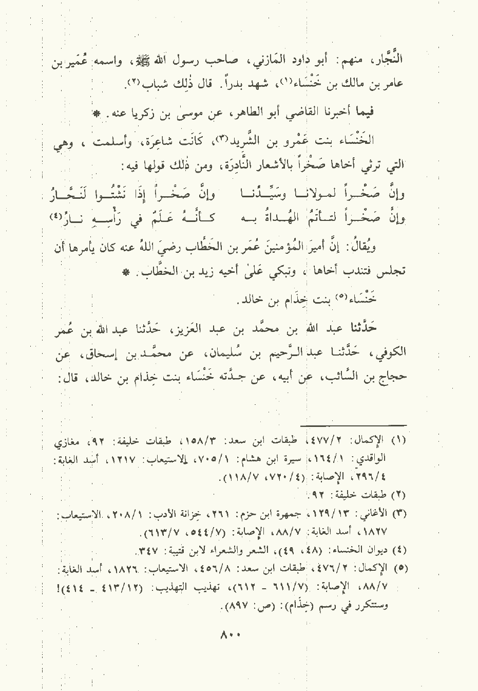 حَدَّثَنا عَبد الله بن مُحمَّد بن عبد العزيز , حَدَّثَنا عَبد الله بن عُمَر الكُوفِيّ , حَدَّثَنا عَبد الرَّحِيم بن سُلَيْمان , عن مُحمَّد بن إِسْحَاق , عن حجاج بن السَّائب , عن أبيه , عن جدته خَنْسَاء بنت خذام بن خالد قال: وكانت أيما من رجل فزوجها أبوها رجلا من بني عَوْف فخطبت إلى أبي لبابة بن عبد المُنْذر فارتفع شأنها إلى النَّبِيّ صلى الله عليه وسلم فأمر رسول الله صلى الله عليه وسلم أباها أن يلحقها بهواها فتزوجت أبا لبابة.