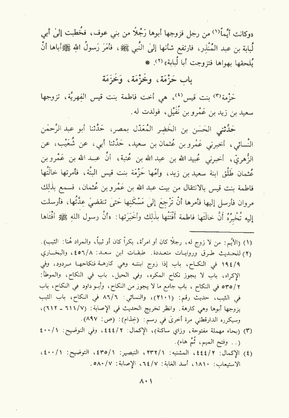 حَدَّثني الحَسَن بن الخضر المعدل بمصر , حَدَّثَنا أبو عبد الرَّحْمن النَّسَائِيّ , أخبرني عَمْرو بن عُثْمان بن سَعِيد , حَدَّثَنا أبي , عن شُعَيْب , عن الزُّهْريّ , أخبرني عُبَيْد الله بن عَبد الله بن عتبة أن عَبد الله بن عَمْرو بن عُثْمان طلق ابنة سعيد بن زيد وأمها حزمة بنت قيس البتة فأمرتها خالتها فاطمة بنت قيس بالانتقال من بيت عَبد الله بن عَمْرو بن عُثْمان فسمع بذلك مَرْوان فأرسل إليها فأمرها أن ترجع إلى مسكنها حتى تنقضي عدتها فأرسلت إليه تخبره أن خالتها فاطمة أفتتها بذلك وأخبرتها: أن رسول الله صلى الله عليه وسلم أفتاها بالانتقال حين طلقها أبو عَمْرو بن حفص المخزومي وذكر قصة طويلة.