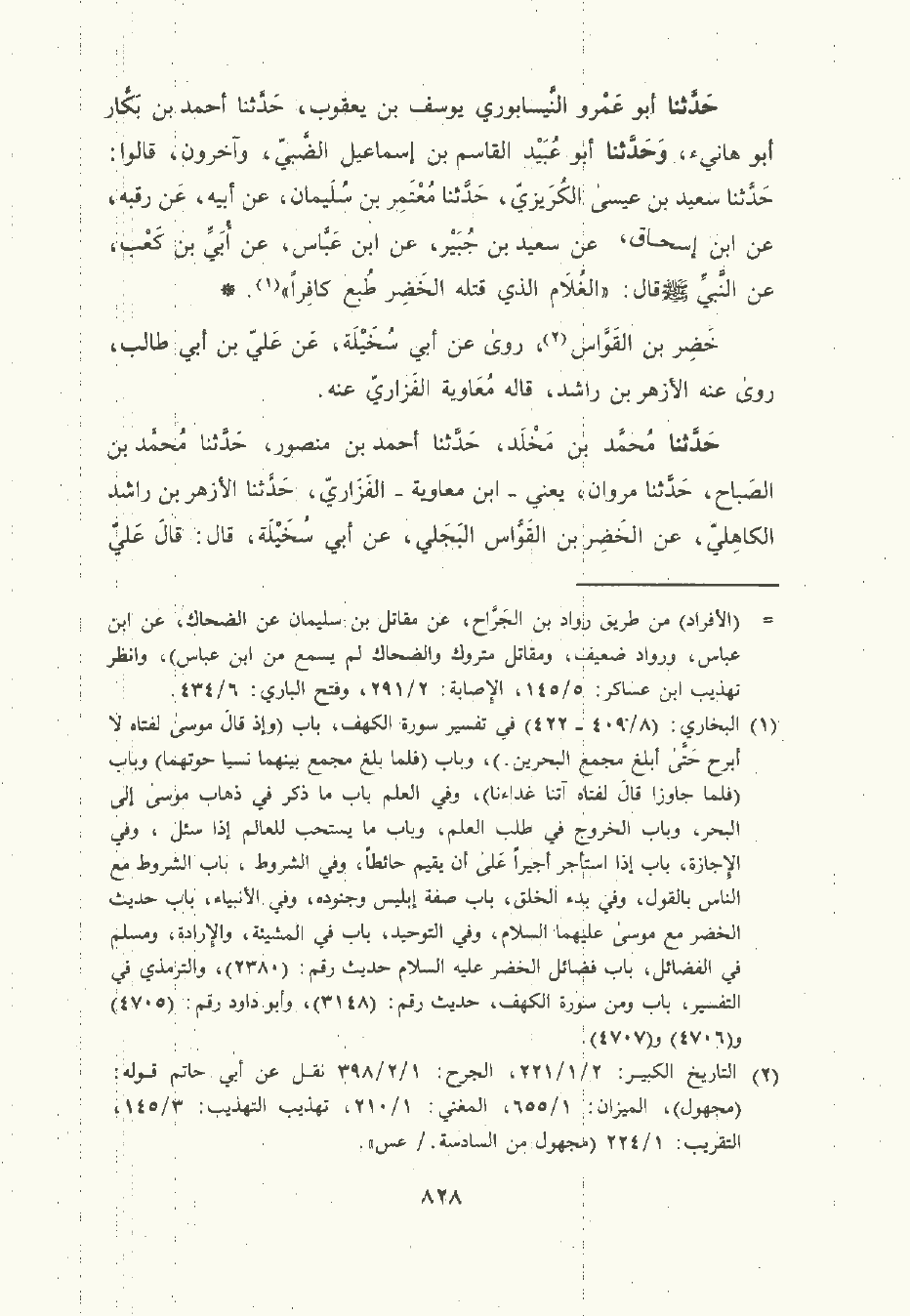 حَدَّثَنا أبو عَمْرو النَّيْسَابوري يُوسُف بن يعقوب , حَدَّثَنا أحمد بن بكار أبو هانىء وحدثنا أبو عبيد القاسم بن إِسْمَاعِيل الضبي وآخرون قالوا: حَدَّثَنا سعيد بن عيسى الكريزي , حَدَّثَنا مُعْتَمر بن سُلَيْمان , عن أبيه , عن رقبة، عن ابن إِسْحَاق , عن سعيد بن جبير، عن ابن عَبَّاس، عن أُبَيّ بن كَعْب , عن النَّبِيّ صلى الله عليه وسلم: الغلام الذي قتله الخضر طبع كافرا.