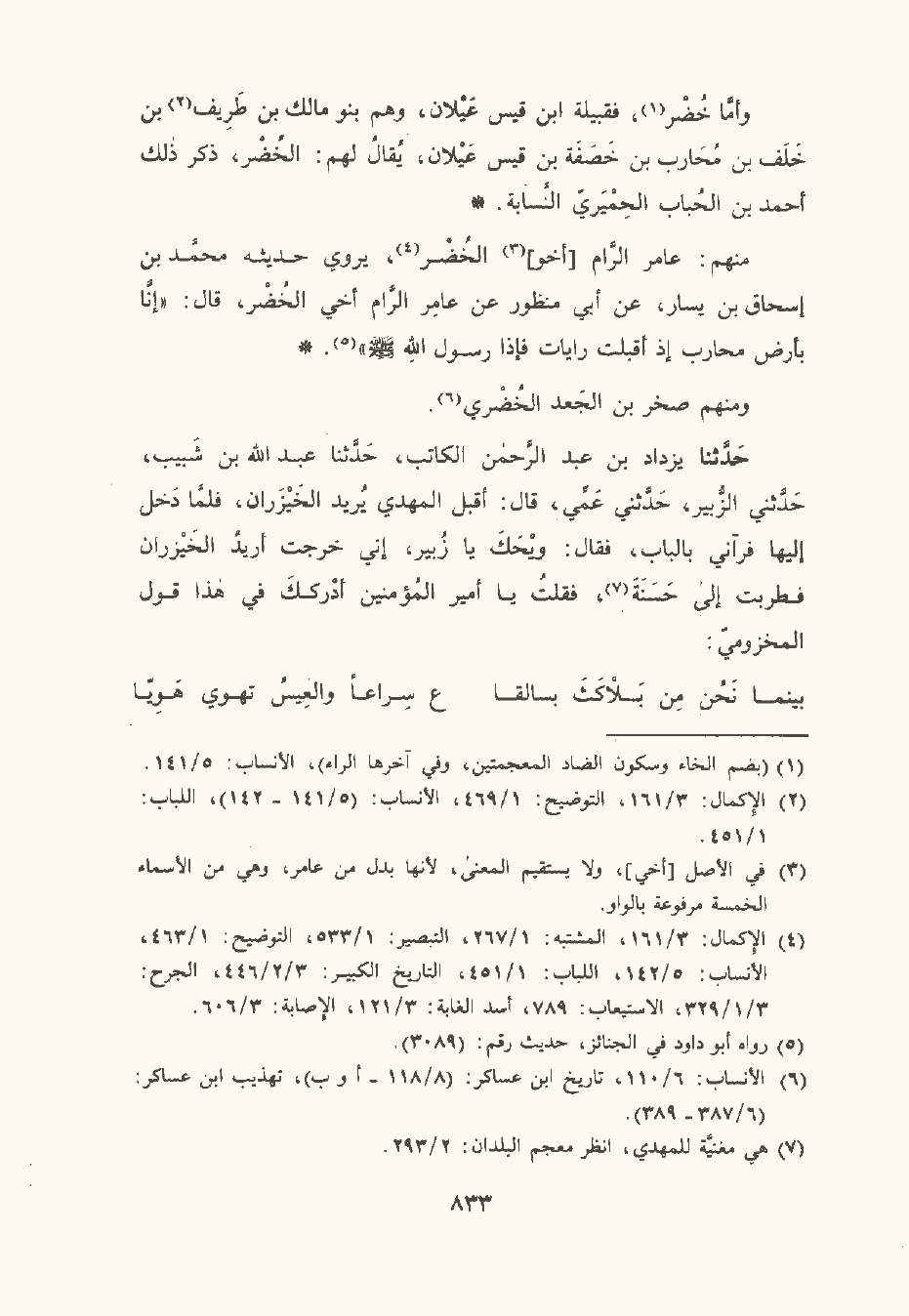 وأمَّا خُضْر , فقبيلة ابن قَيْس عيلان , وهم بنو مالك بن طريف بن خلف بن محارب بن خصفة بن قَيْس عيلان يقال لهم: الخُضْر , ذكر ذلك أحمد بن الحُبَاب الحِمْيَري النسابة.