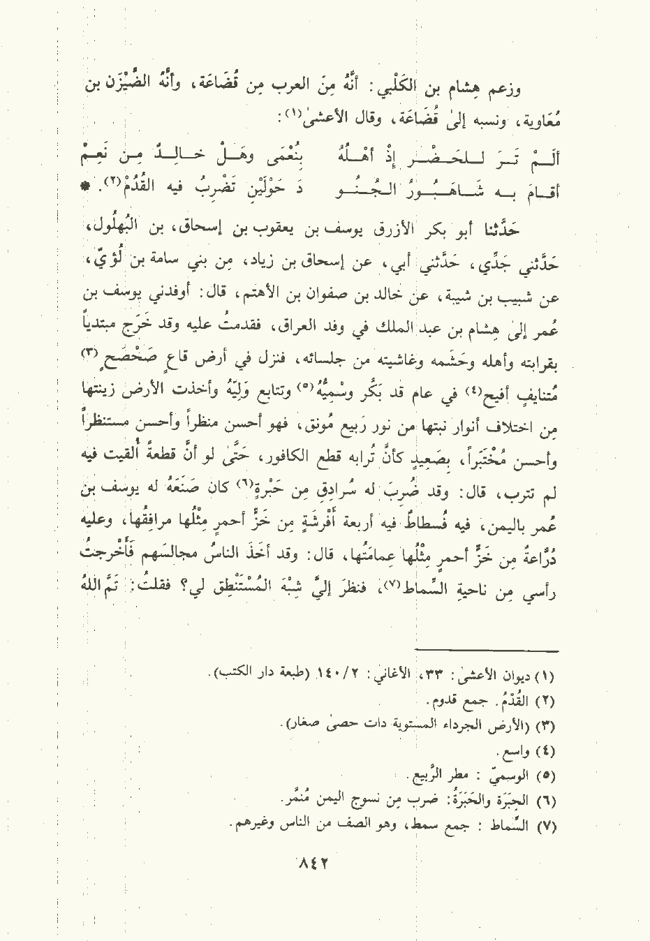 حَدَّثَنا أبو بكر الأزرق يُوسُف بن يعقوب بن إِسْحَاق بن البهلول , حَدَّثني جدي , حَدَّثني أبي , عن إِسْحَاق بن زياد من بني سامة بن لُؤَيّ , عن شبيب بن شيبة , عن خالد بن صَفْوان بن الأهتم قال: أوفدني يُوسُف بن عُمَر إلى هشام بن عبد الملك في وفد العراق فقدمت عليه وقد خرج مبتديا بقرابته وأهله وحشمه وغاشيته من جلسائه فنزل في أرض قاع صحصح متنايف أفيح في عام قد بكر وسميه وتتابع وليه وأخذت الأرض زينتها من اختلاف أنوار نبتها من نور ربيع مونق , فهو أحسن منظرا وأحسن مستنظرا وأحسن مختبرا بصعيد كأن ترابه قطع الكافور حتى لو أن قطعه ألقيت فيه لم تترب قال: وقد ضرب له سرادق من حبرة كان صنعه له يُوسُف بن عُمَر باليمن فيه فسطاط فيه أربعة أفرشة من خز أحمر مثلها مرافقها وعليه دُرَّاعة من خز أحمر مثلها عمامتها , قال: وقد أخذ الناس مجالسهم فأخرجت رأسي من ناحية السماط فنظر إلى شبه المستنطق لي؟