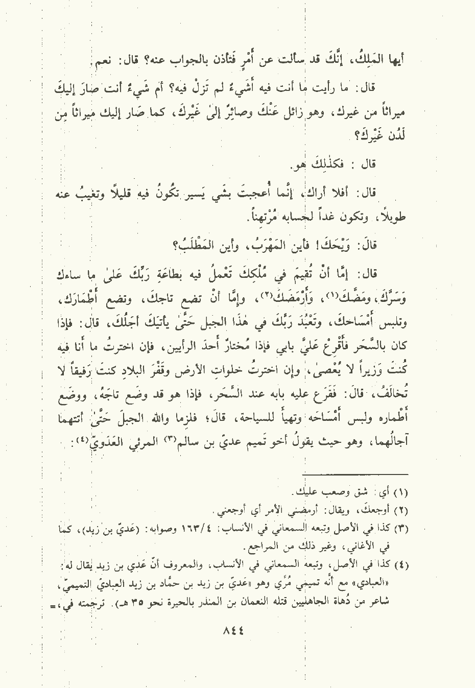 قال: إما أن تقيم في ملكك تعمل فيه بطاعة ربك على ما ساءك وسرك ومضك وأرمضك وأمَّا أن تضع تاجك وتضع أطمارك وتلبس أمساحك وتعبد ربك في هذا الجبل حتى يأتيك أجلك، قال: فإذا كان بالسحر فأقرع علي بابي فإذا مختار أحد الرأيين، فإن اخترت ما أنا فيه كنت وزيرا لا يعصى وإن اخترت خلوات الأرض وقفر البلاد كنت رفيقا لا تخالف قال: فقرع عليه بابه عند السحر فإذا هو قد وضع تاجه ووضع أطماره ولبس أمساحه , وتهيأ للسياحة , قال: فلزما والله الجبل حتى أتتهما آجلهما , وهو حيث يقول , أخو تميم عدي بن سالم المرئي العدوي: