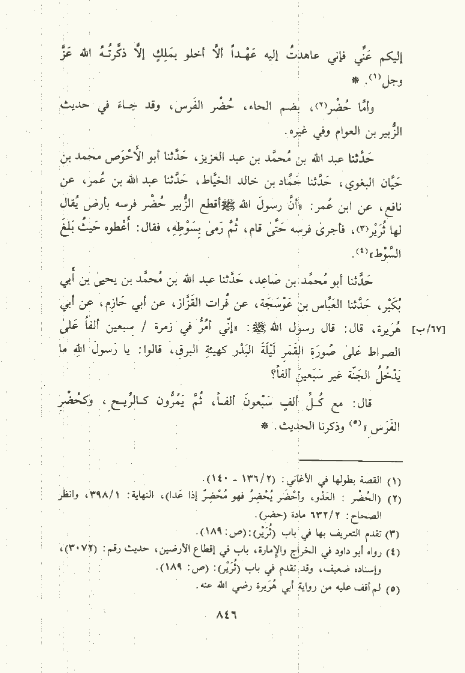 حَدَّثَنا عَبد الله بن مُحمَّد بن عبد العزيز , حَدَّثَنا أبو الأَحْوَص مُحمَّد بن حَيَّان البغوي , حَدَّثَنا حماد بن خالد الخياط , حَدَّثَنا عَبد الله بن عُمَر , عن نافع، عن ابن عُمَر: أن رسول الله صلى الله عليه وسلم أقطع الزُّبَيْر حُضْر فرسه بأرض يقال لها ثرير، فأجرى فرسه حتى قام، ثم رمى بسوطه، فقال: أعطوه حيث بلغ السوط.