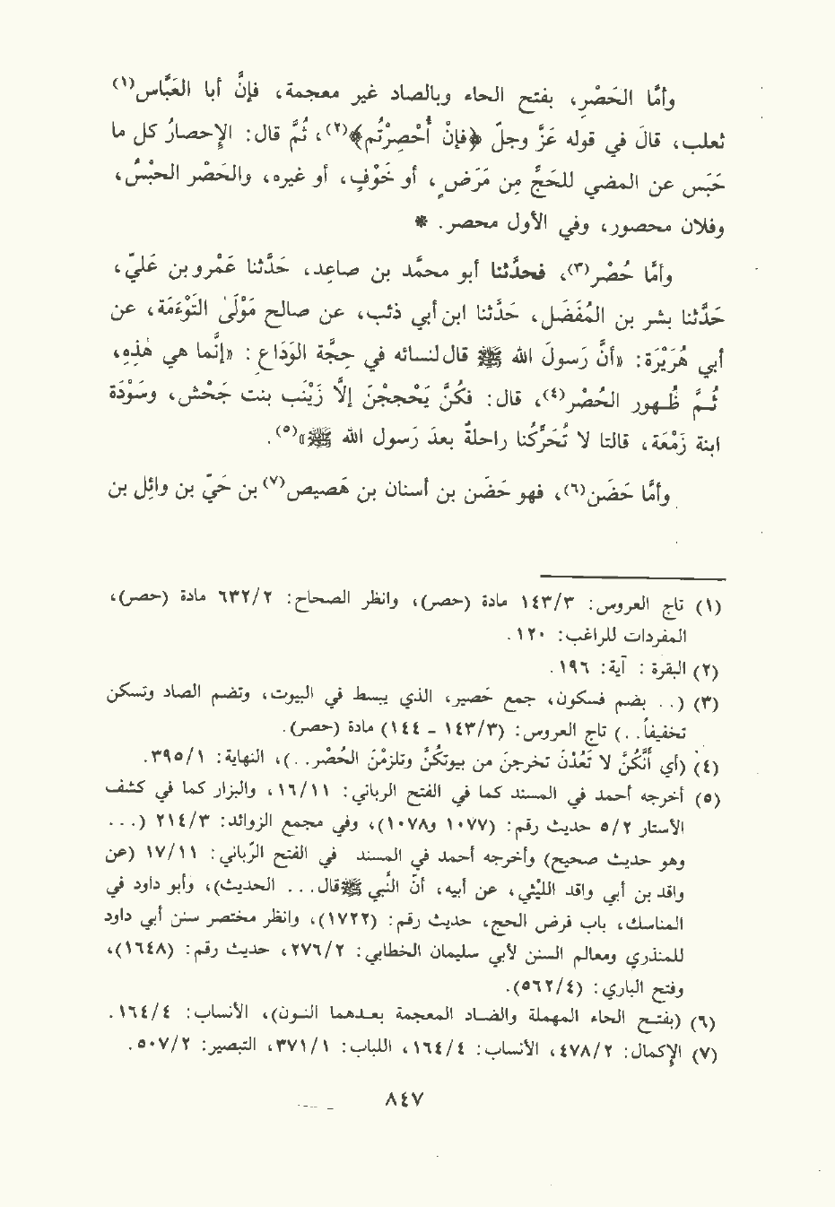 وأمَّا الحَصْر , بفتح الحاء وبالصاد غير المعجمة , فإن أبا العَبَّاس ثعلب قال في قوله عز وجل {فَإِنْ أُحْصِرْتُمْ} , ثم قال: الإحصار كل ما حبس , عن المضي للحج من مرض أو خوف أو غيره والحصر الحبس فلان محصور وفي الأول محصر.