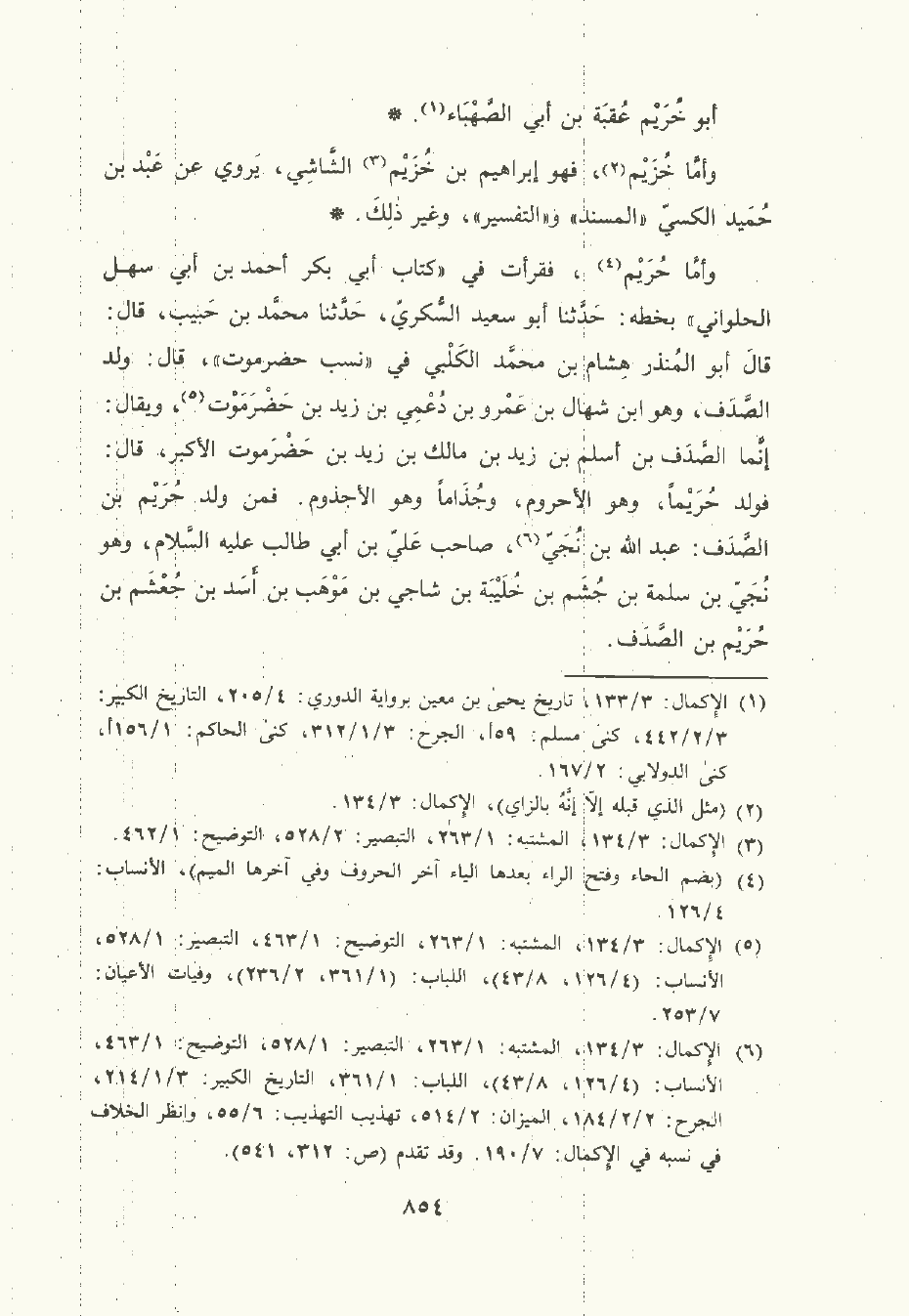 وأمَّا حُرَيْم فقرأت في كتاب أبي بكر أحمد بن أبي سهل الحُلْوَانيّ بخطه: حَدَّثَنا أبو سَعِيد السُّكريّ , حَدَّثَنا مُحمَّد بن حبيب قال: قال أبو المُنْذر هشام بن مُحمَّد الكلبي في نسب حَضَرَمَوت، قال: ولد الصدف , وهو ابن شهال بن عَمْرو بن دعمي بن زيد بن حَضَرَمَوت , ويقال: إنما الصدف بن أسلم بن زيد بن مالك بن حَضَرَمَوت الأكبر قال: فولد حُرَيْمًا , وهو الأحروم وجذاما , وهو الأجذم. فمن ولد حريم بن الصدف: عَبد الله بن نُجَي صاحب عَلِيّ بن أبي طَالِب عليه السَّلام , وهو نجي بن سلمة بن جشم بن خليبة بن شاجي بن موَهْب بن أسد بن جعشم بن حُرَيْم بن الصدف.