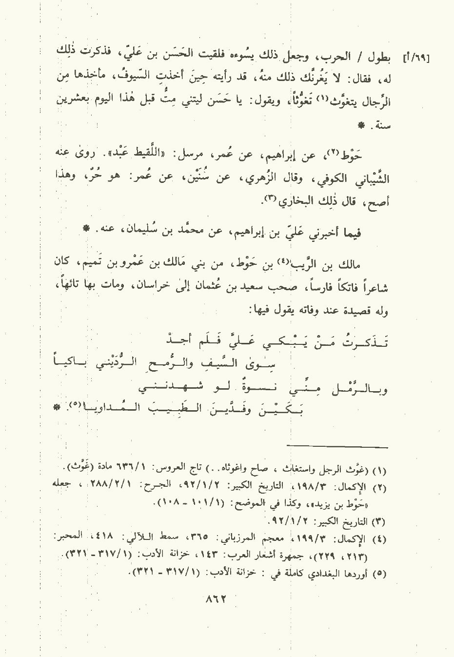 مالك بن الريب بن حوط من بني مالك بن عَمْرو بن تميم كان شاعرا فاتكا فارسا صحب سعيد بن عُثْمان إلى خرسان ومات بها تائها وله قصيدة عند وفاته يقول فيها: