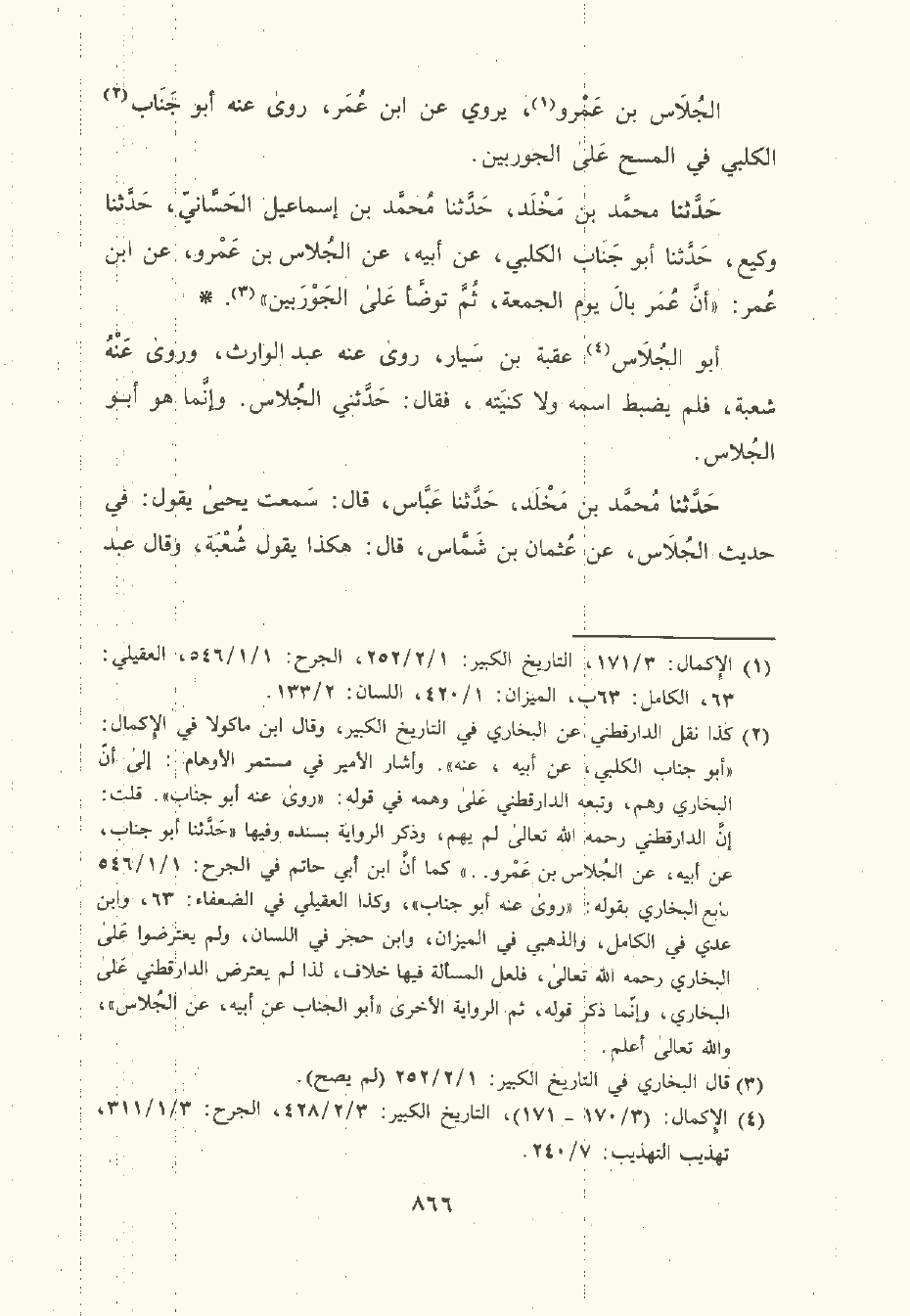 حَدَّثَنا مُحمَّد بن مَخْلَد , حَدَّثَنا مُحمَّد بن إِسْمَاعِيل الحساني , حَدَّثَنا وكيع , حَدَّثَنا أبو جناب الكلبي , عن أبيه , عن الجُلاَس بن عَمْرو، عن ابن عُمَر: أن عُمَر بال يوم الجمعة , ثم توضأ على الجوربين.