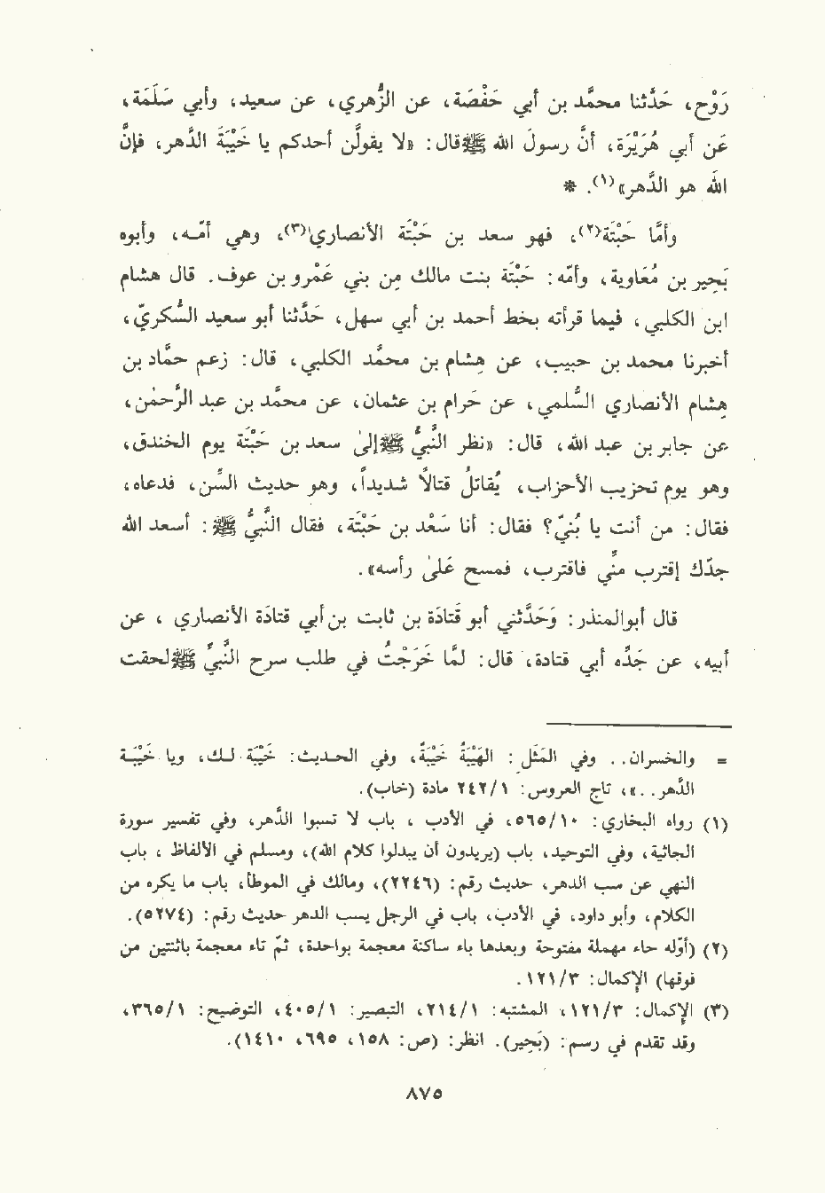 وأمَّا حَبْتَة , فهو سعد بن حَبْتَة الأَنْصَاريّ وهي أمه , وأبوه بحير بن مُعَاوية , وأمه: حَبْتَة بنت مالك من بني عَمْرو بن عَوْف. قال هشام بن الكَلْبيّ فيما قرأته بخط أحمد بن أبي سهل , حَدَّثَنا أبو سَعِيد السُّكريّ , أخبرنا مُحمَّد بن حبيب , عن هشام بن مُحمَّد الكلبي قال: زعم حماد بن هشام الأَنْصَاريّ السلمي , عن حرام بن عُثْمان , عن مُحمَّد بن عبد الرَّحْمن , عن جابر بن عَبد الله قال: نظر النَّبِيّ صلى الله عليه وسلم إلى سعد بن حَبْتَة يوم الخندق وهو يوم تحزيب الحزاب يقاتل قتالا شديدا وهو حديث السن فدعاه فقال: من أنت يا بني؟ فقال: أنا سعد بن حَبْتَة فقال النَّبِيّ صلى الله عليه وسلم: أسعد الله جدك اقترب مني فاقترب فمسح على رأسه.