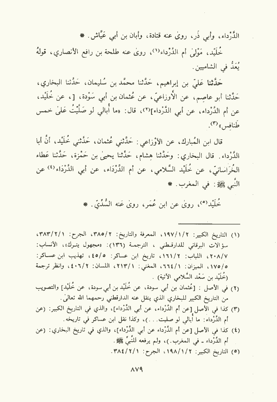 قال ابن المبارك , عن الوزاعي , حَدَّثني عُثْمان , حَدَّثني خُلَيْد أن أبا الدَّرْدَاء قال البُخَاريُّ: وحدثنا هشام , حَدَّثَنا يَحْيى بن حَمْزة , حَدَّثَنا عَطاء الخراساني , عن خُلَيْد السلامي , عن أم الدَّرْدَاء، عن أبي الدَّرْدَاء , عن النَّبِيّ صلى الله عليه وسلم في المغرب.
