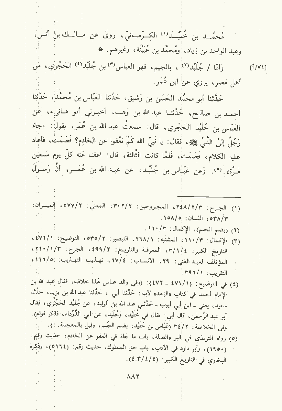 وأمَّا جُلَيْد بالجيم , فهو العَبَّاس بن جُلَيْد الحَجْري من أهل مِصْر , يَرْوي عن ابن عُمَر.
