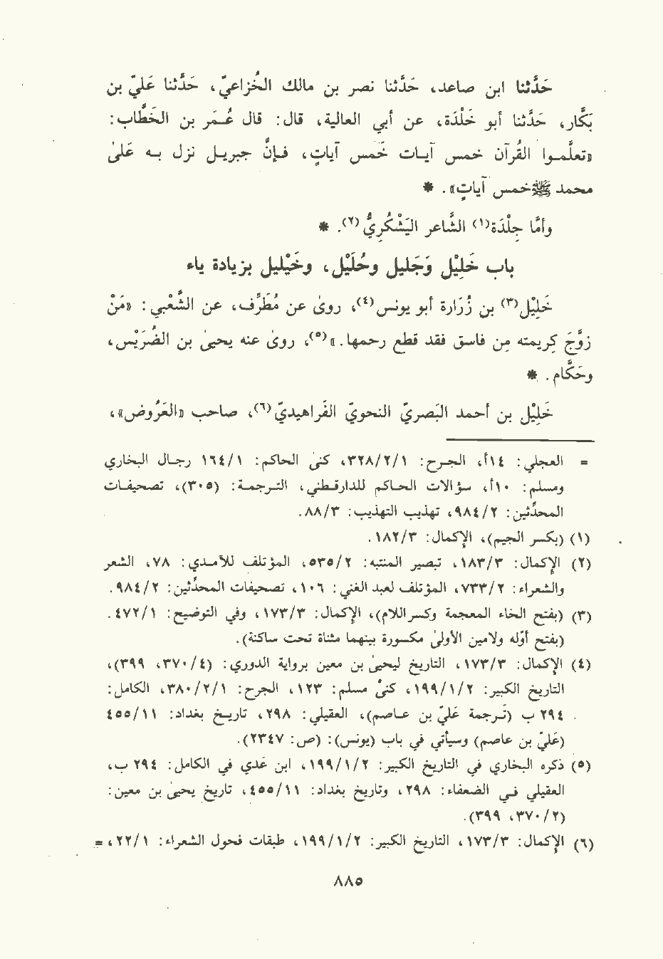 خَلِيل بن أحمد البَصْريّ النحوي الفراهيدي , صاحب العروض , سمع منه حمَّاد بن زيد , وعلي بن نصر وعون بن عمارة والنضر بن شميل , والليث بن مظفر , يُكْنَى أبا عبد الرَّحْمن.