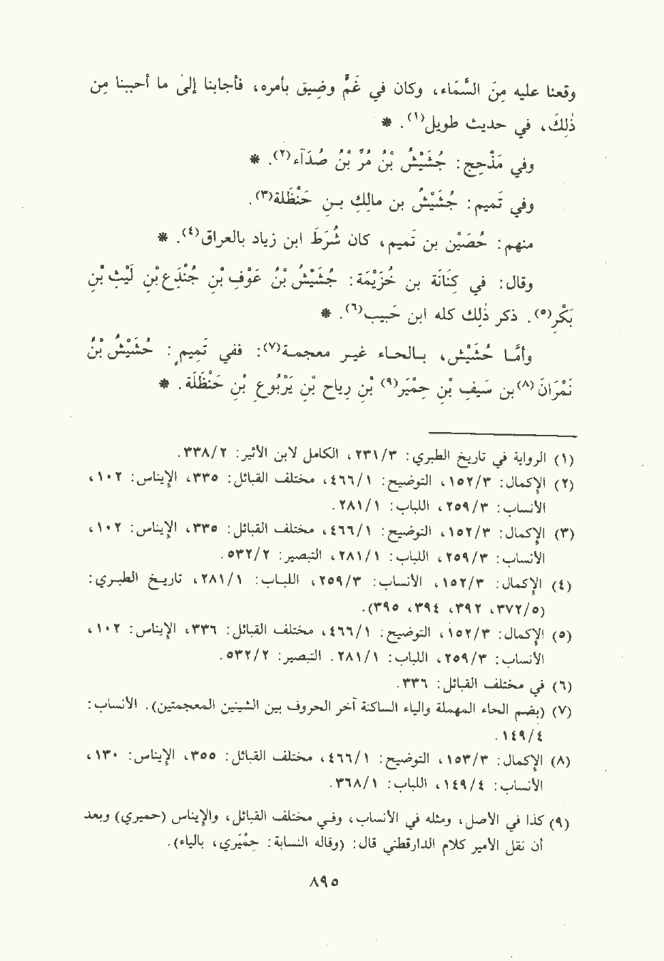 وأمَّا حُشَيْش بالحاء غير معجمة: ففي تَميم: حُشَيْش بن نمران بن سيف بن حِمْيَر بن رياح بن يربوع بن حَنْظَلة.