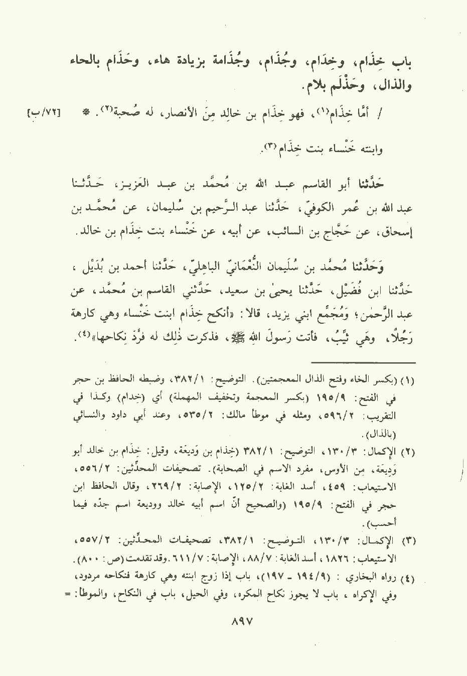 حَدَّثَنا أبو القاسم عَبد الله بن مُحمَّد بن عبد العزيز , حَدَّثَنا عَبد الله بن عُمَر الكُوفِيّ , حَدَّثَنا عَبد الرَّحِيم بن سُلَيْمان , عن مُحمَّد بن إِسْحَاق , عن حجاج بن السَّائب , عن أبيه , عن خنساء بنت خِذَام بن خالد.