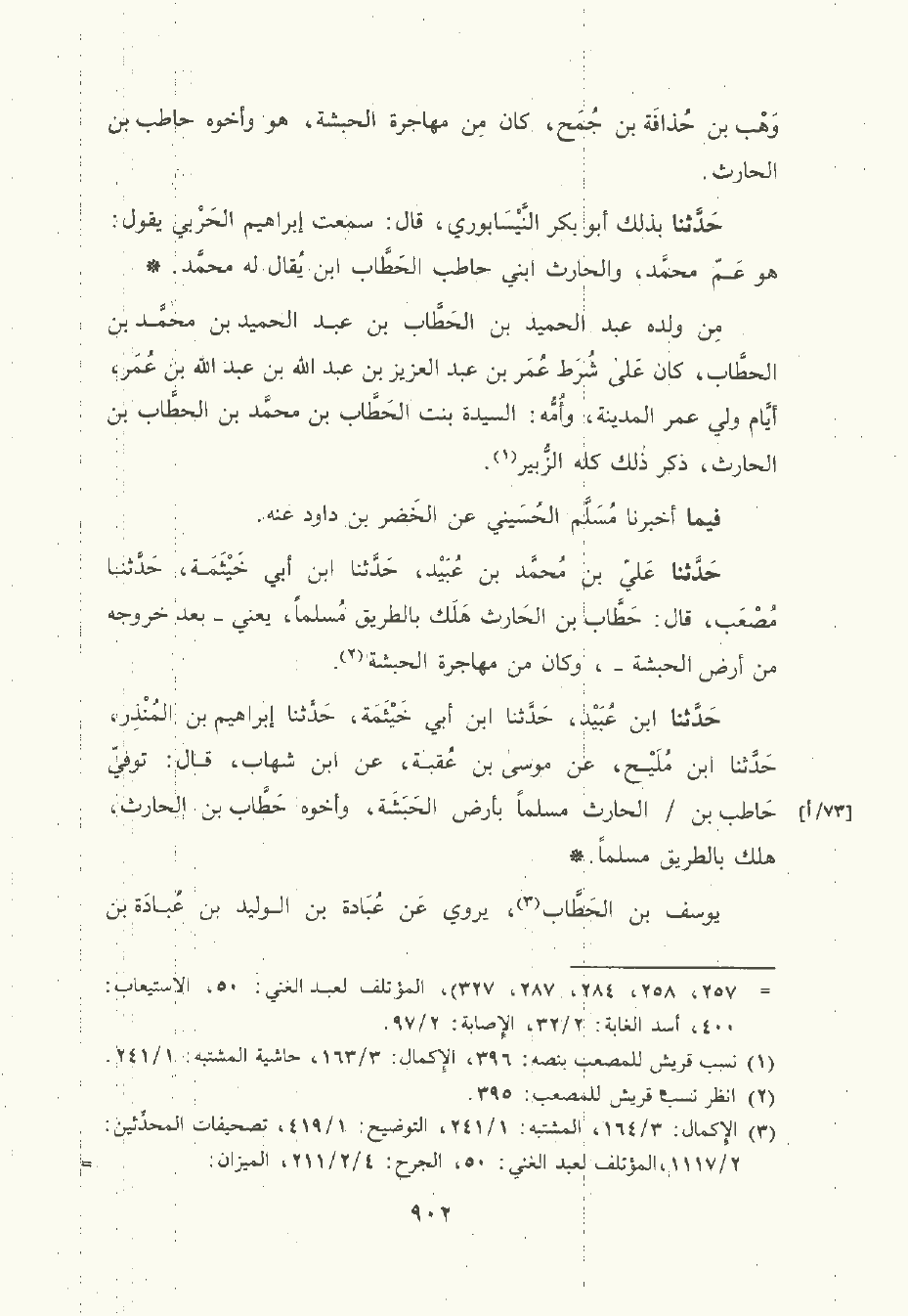 حَدَّثَنا علي بن مُحمَّد بن عُبَيْد , حَدَّثَنا ابن أبي خَيْثَمة , حَدَّثَنا مصعب قال: حَطَّاب بن الحارث هلك بالطريق مسلما يعني – بعد خروجه من أرض الحبشة – , وكان من مهاجر الحبشة.
