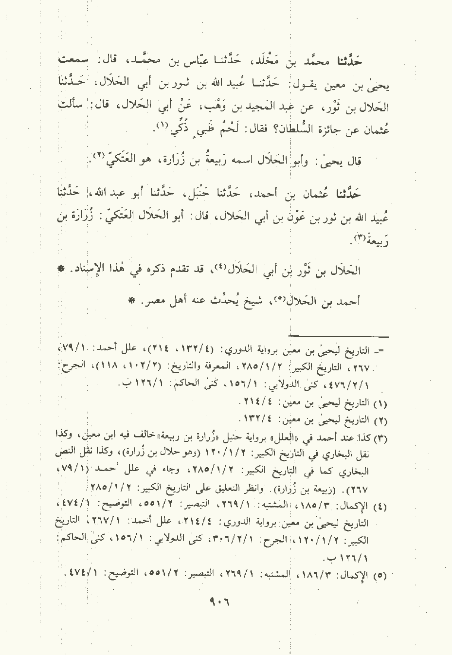 حَدَّثَنا مُحمَّد بن مَخْلَد , حَدَّثَنا عَبَّاس بن مُحمَّد قال: سَمِعتُ يَحْيى بن مَعِين يقول: حَدَّثَنا عُبَيْد الله بن ثور بن أبي الحَلاَل , حَدَّثَنا الحَلال بن ثَوْر، عن عَبد المجيد بن وَهْب، عن أبي الحَلال قال: سألت عُثْمان عن جائزة السلطان؟ فقال: لَحْمُ ظَبْيٍ ذُكِّي.