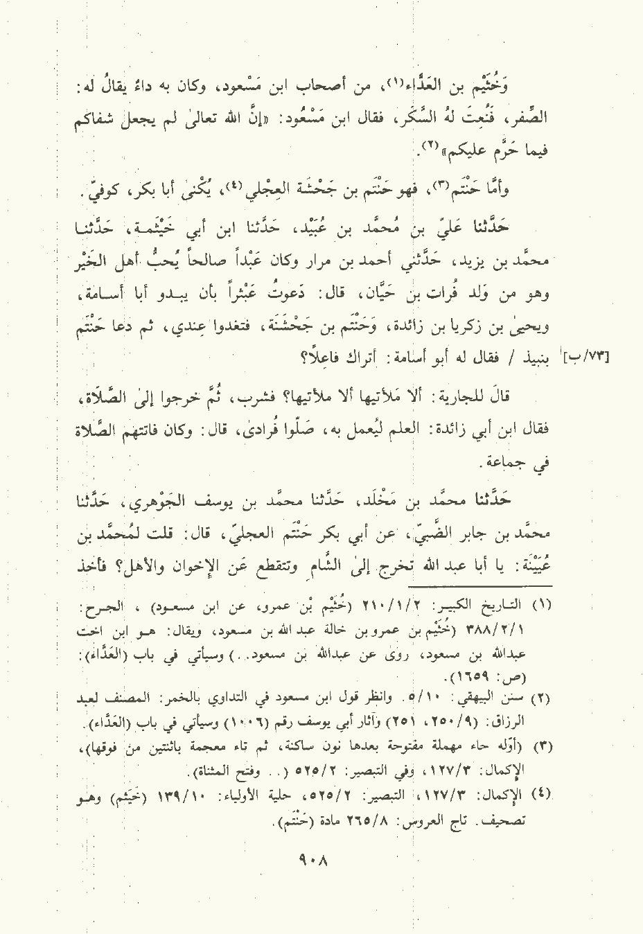 حَدَّثَنا مُحمَّد بن مَخْلَد , حَدَّثَنا مُحمَّد بن يُوسُف الجوهري , حَدَّثَنا مُحمَّد بن جابر الضبي، عن أبي بكر حنتم العجلي قال: قلت لمحمد بن عيينة: يا أبا عَبد الله تخرج إلى الشَّام وتتقطع , عن الإخوان والأهل؟ فأخذ بيدي فأراني الجبانة وقال: جدع الله أنف من نضن بمعاشرة من ترى، قال: وأنا معهم يوم خرجوا ابن عيينة , وابن المبارك , وأبو أسامة والمحاربي وخرج الناس يشيعونهم ولم يأخذوا طريق بغداد.