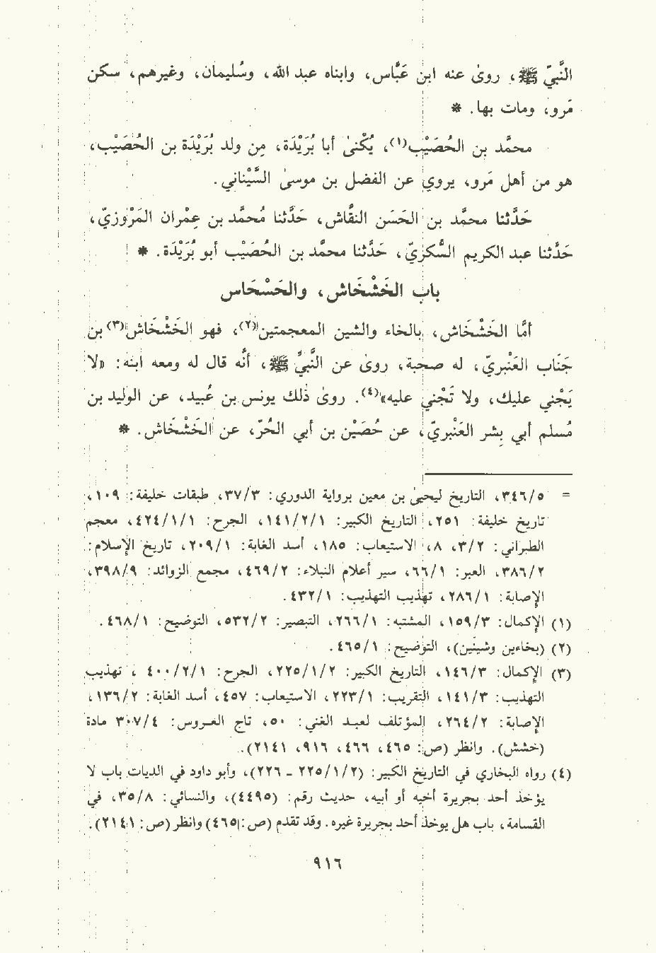 أمّا الخَشْخَاش بالخاء والشين المعجمتين , فهو الخَشْخَاش بن جناب العنبري , له صُحْبة , روى عن النَّبِيِّ صلى الله عليه وسلم أنه قال له ومعه ابنه: لا يجني عليك ولا تجني عليه. روى ذلك يُونُس بن عُبَيْد , عن الوليد بن مسلم أبي بشر العنبري , عن حصين بن أبي الحر , عن الخَشْخَاش.