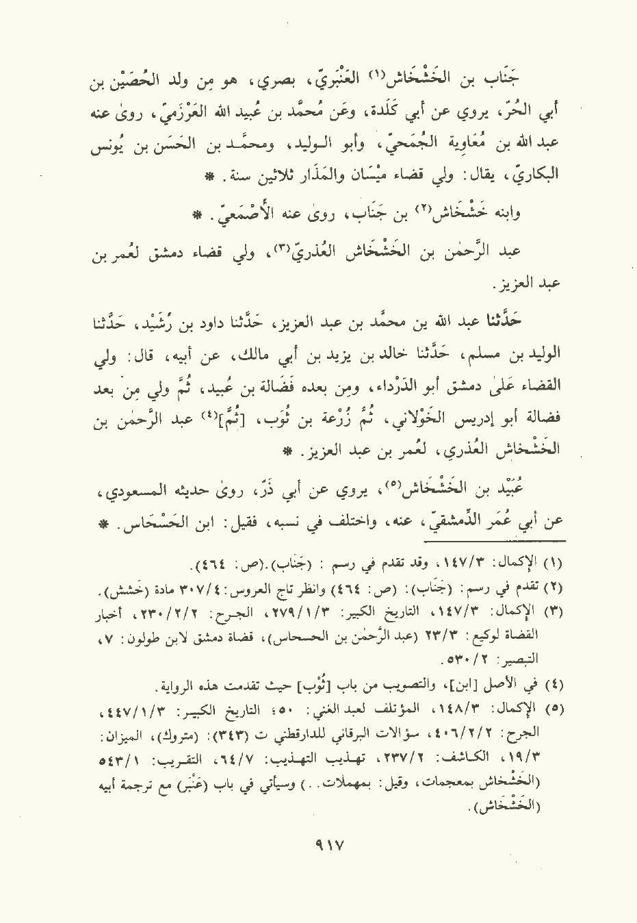 حَدَّثَنا عَبد الله بن مُحمَّد بن عبد العزيز , حَدَّثَنا داود بن رشيد , حَدَّثَنا الوليد بن مسلم , حَدَّثَنا خالد بن يزيد بن أبي مالك , عن أبيه قال: ولي القضاء على دمشق أبو الدَّرْدَاء , ومن بعده فضالة بن عبيد , ثم ولي من بعد فضالة أبو إدريس الخَوْلاني , ثم زرعة بن ثوب , ثم عبد الرَّحْمن بن الخَشْخَاش العذري لعمر بن عبد العزيز.