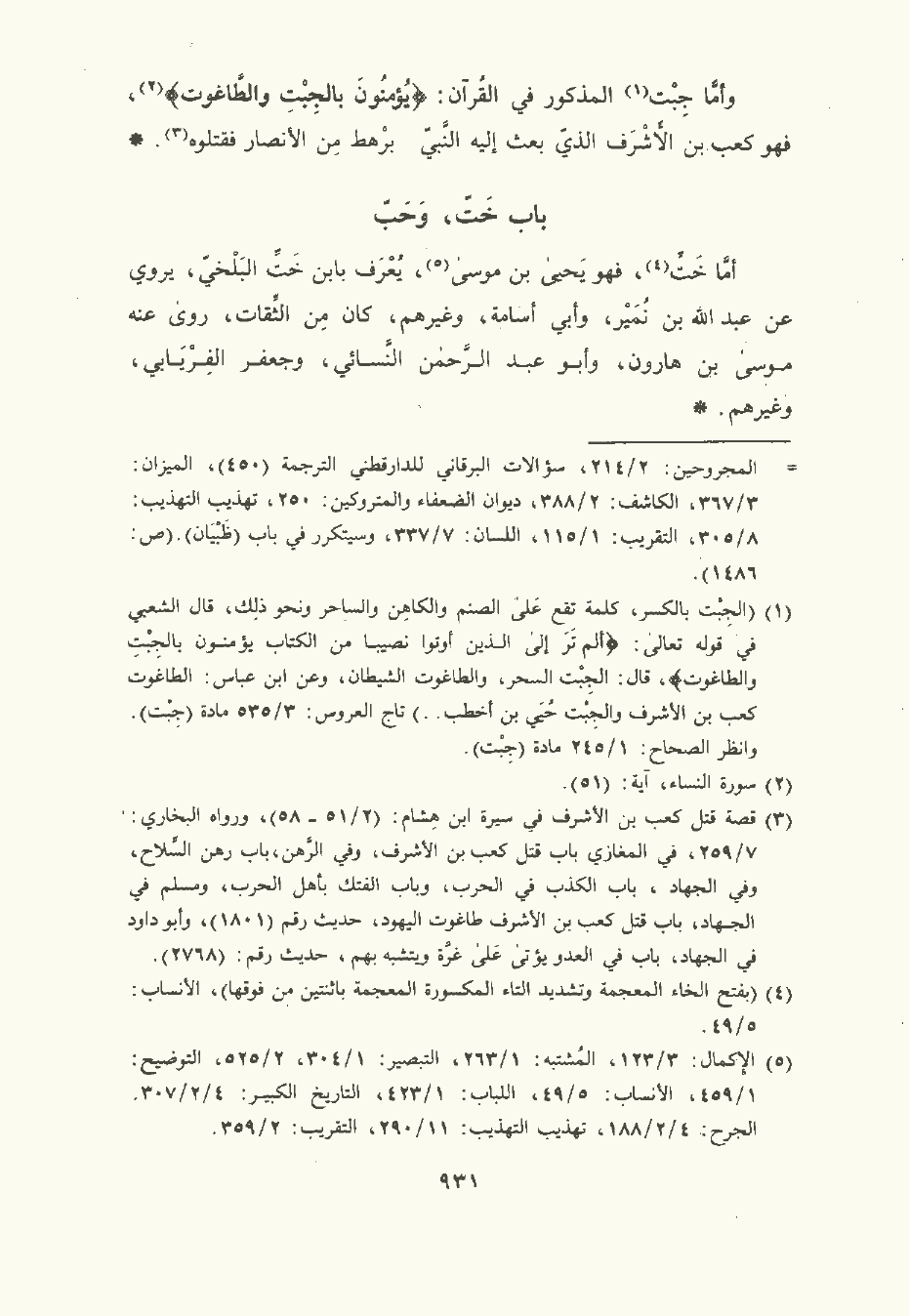 وأمَّا جِبْت المذكور في القُرْآن {يُؤْمِنُونَ بِالْجِبْتِ وَالطَّاغُوتِ} , فهو كَعْب بن الأَشْرَف الذي بعث إليه النَّبِيّ صلى الله عليه وسلم برهط من الأَنْصَار فقتلوه.