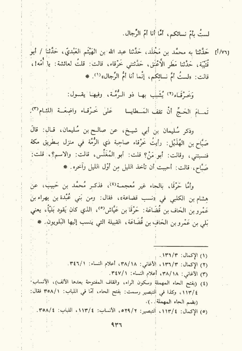 حَدَّثَنا به مُحمَّد بن مَخْلَد , حَدَّثَنا عَبد الله بن الهَيْثَم العبدي , حَدَّثَنا أبو قتيبة , حَدَّثَنا مطر الأعنق , حدثتني خرقاء , قالت: قلت لعائشة: يا امة! قالت: لست أم نسائكم , إنما أنا أم الرِّجال.