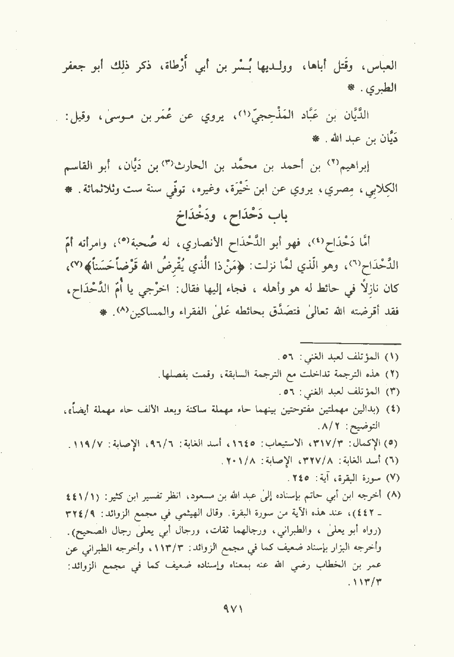 أمّا دَحْدَاح , فهو أبو الدَّحْدَاح الأَنْصَاريّ , له صُحْبة , وامرأته أم الدَّحْدَاح , وهو الَّذي لما نزلت {مَنْ ذَا الَّذِي يُقْرِضُ اللَّهَ قَرْضًا حَسَنًا} , كان نازلا في حائط له هو وأهله فجاء إليها فقال: اخرجي يا أم الدَّحْدَاح فقد أقرضته الله تعالى فتصدق بحائطه على الفقراء والمساكين.