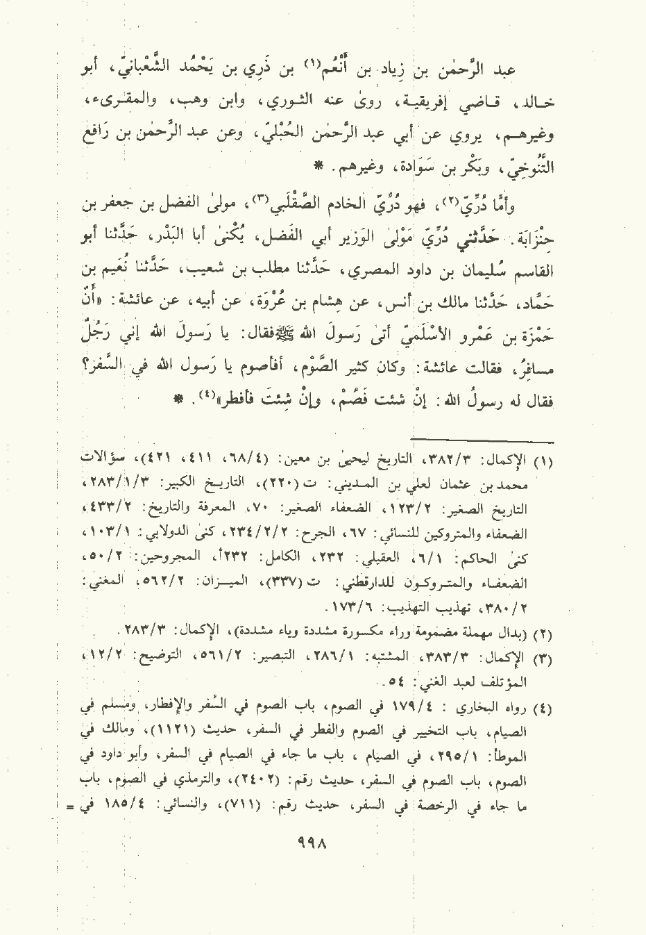 وأمَّا دُرِّيّ , فهو دُرِّيّ الخادم الصقلبي مولى الفضل بن جعفر بن حنزابة حدثني دُرِّيّ مولى الوزير أبي الفضل , يُكْنَى أبا البدر , حَدَّثَنا أبو القَاسِم سُلَيْمان بن داود المِصْرِيّ , حَدَّثَنا مطلب بن شُعَيْب , حَدَّثَنا نُعَيْم بن حماد , حَدَّثَنا مَالِك بن أنس , عن هِشَام بن عُرْوَة , عن أبيه , عن عائشة: أن حَمْزة بن عَمْرو الأسلمي أتى رسول الله صلى الله عليه وسلم فقال: يا رسول الله إني رجل مسافر فقالت عائشة: وكان كثير الصوم أفأصوم يا رسول الله في السفر؟ فقال له رسول الله: إن شئت فصم وإن شئت فأفطر.