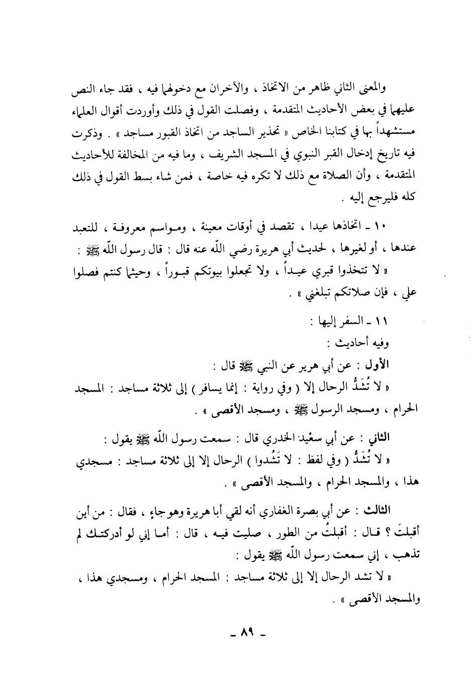 "لا تشد الرحال إلا وفي رواية: إنما يسافر إلى ثلاثة مساجد: المسجد الحرام ومسجد الرسول صلى الله عليه وسلم ومسجد الأقصى".