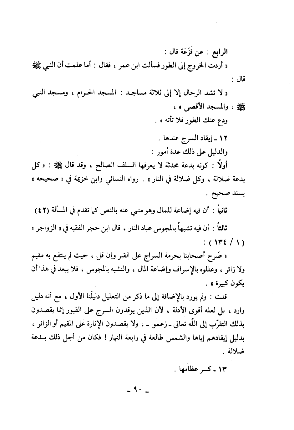 قلت: ولم يورد بالإضافة إلى ما ذكر من التعليل دليلنا الأول مع أنه دليل وارد بل لعله أقوى الأدلة لأن الذين يوقدون السرج على القبور إنما يقصدون بذلك التقرب إلى الله تعالى - زعموا - ولا يقصدون الإنارة على المقيم أو الزائر بدليل إيقادهم إياها والشمس طالعة في رابعة النهار فكان من أجل ذلك بدعة ضلالة.
