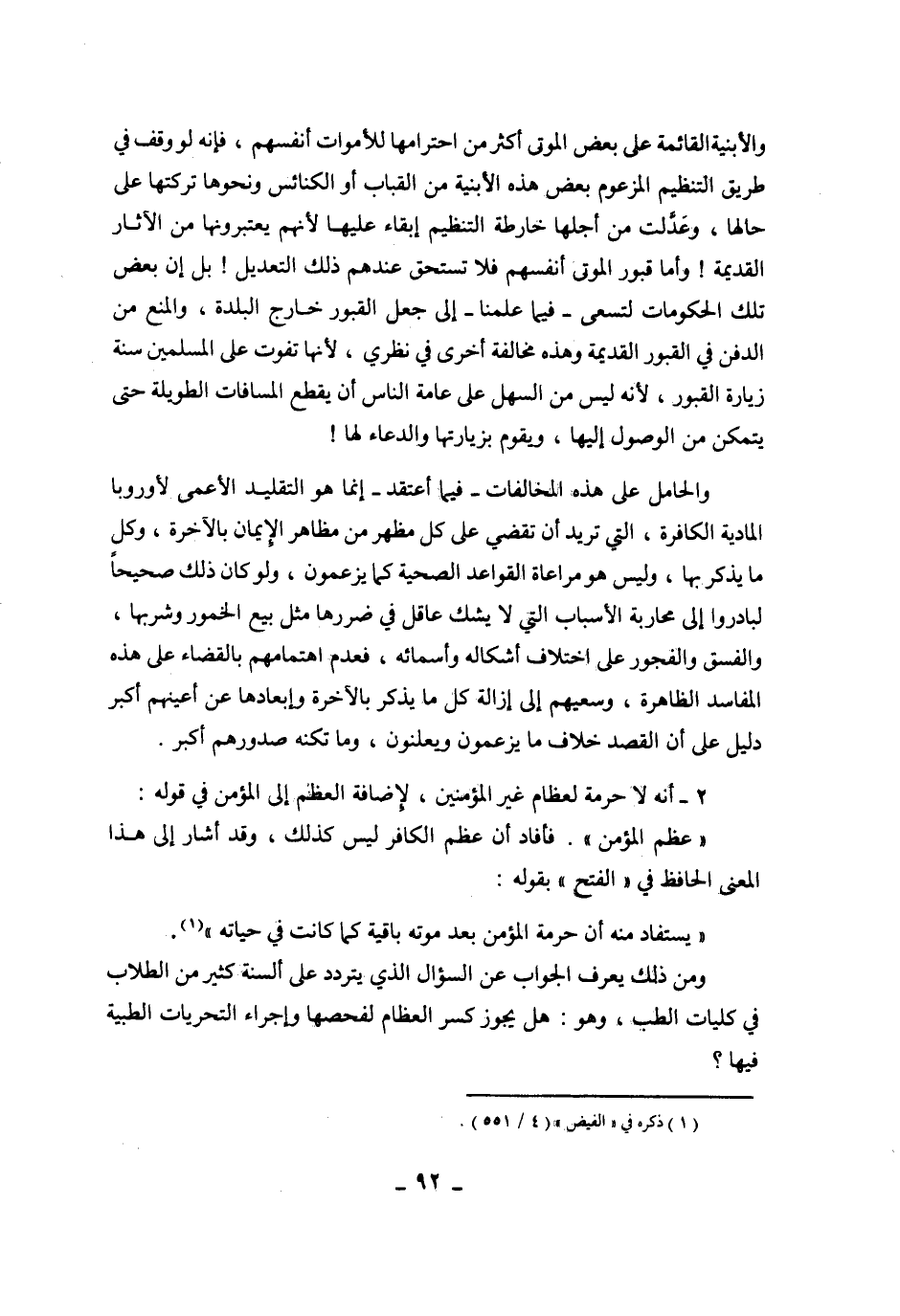 والأبنية القائمة على بعض الموتى أكثر من احترامه للأموات أنفسهم فإنه لو وقف في طيق التنظيم المزعوم بعض هذه الأبنية من القباب أو الكنائس أو نحوها تركتها على حالها وعدلت من أجلها خارطة التنظيم إبقاء عليها لأنهم يعتبرونها من الآثار القديمة وأما قبور الموتى أنفسهم فلا تستحق عندهم ذلك التعديل بل إن بعض تلك الحكومات لتسعى - فيما علمنا - إلى جعل القبور خارج البلدة والمنع من الدفن في القبور القديمة وهذه مخالفة أخرى في نظري لأنها تفوت على المسلمين سنة زيارة القبور لأنه ليس من السهل على عامة الناس أن يقطع المسافات الطويلة حتى يتمكن من الوصول إليها ويقوم بزيارتها والدعاء لها.