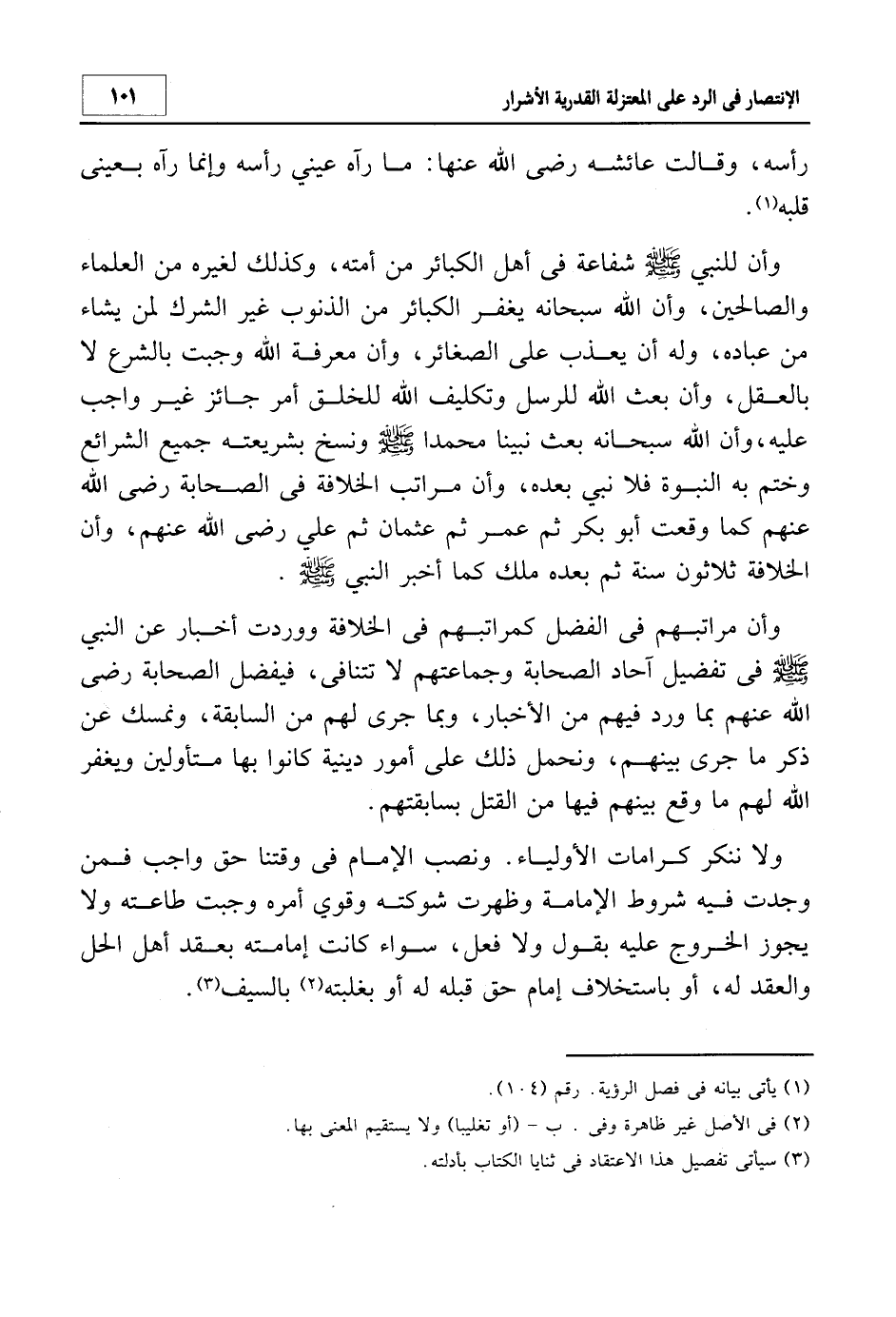 وأن للنبي - صلى الله عليه وسلم- شفاعة في أهل الكبائر من أمته، وكذلك لغيره من العلماء والصالحين، وأن الله سبحانه يغفر الكبائر من الذنوب غير الشرك لمن يشاء من عباده، وله أن يعذب على الصغائر، وأن معرفة الله وجبت بالشرع لا بالعقل، وأن بعث الله للرسل وتكليف الله للخلق أمر جائز غير واجب عليه، وأن الله سبحانه بعث نبينا محمدا - صلى الله عليه وسلم- ونسخ بشريعته جميع الشرائع وختم به النبوة فلا نبي بعده، وأن مراتب الخلافة في الصحابة - رضي الله عنهم - كما وقعت أبو بكر ثم عمر ثم عثمان ثم علي - رضي الله عنهم -، وأن الخلافة ثلاثون سنة ثم بعده ملك كما أخبر النبي صلى الله عليه وسلم.