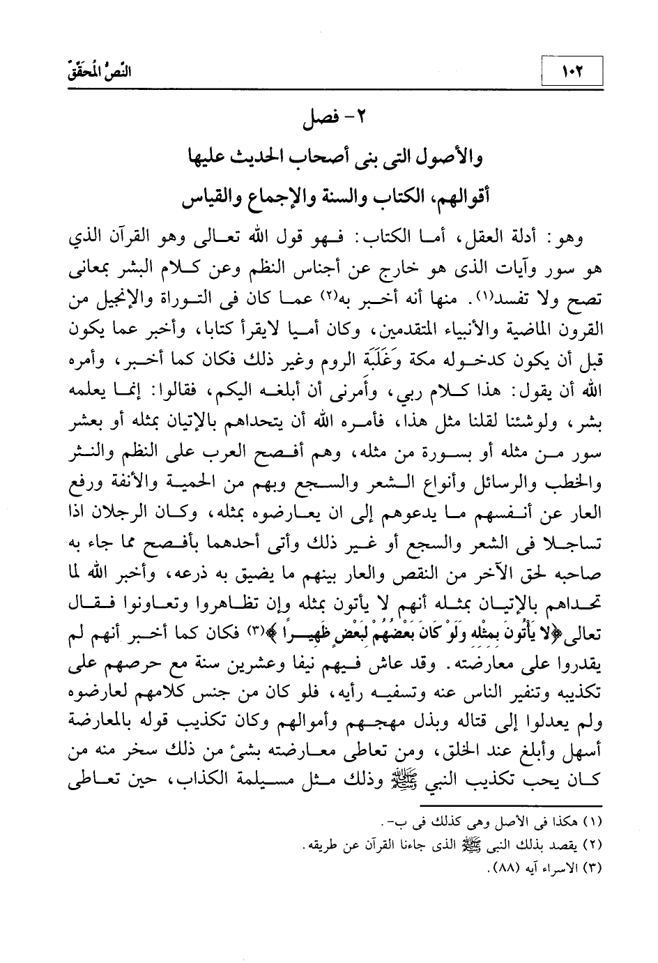 2- فصل: والأصول التي بنى أصحاب الحديث عليها أقوالهم، الكتاب والسنة والإجماع والقياس