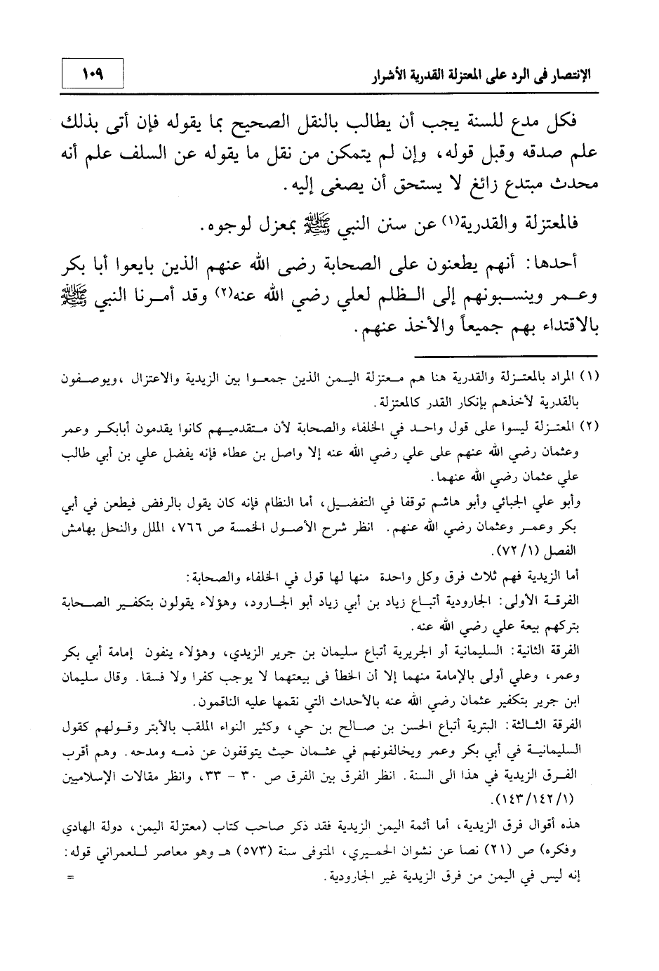 1 المراد بالمعتزلة والقدرية هنا معتزلة اليمن الذين جمعوا بين الزيدية والاعتزال، ويوصفون بالقدرية لأخذهم بإنكار القدر كالمعتزلة.
