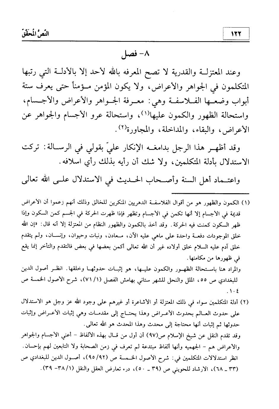وقد تقدم النقل عن شيخ الإسلام ص (97) أن أول من قال بهذه الألفاظ - أعني الأجسام والجواهر والأعراض هم - الجهمية وأنها ألفاظ مبتدعة لم تعرف في زمن الصحابة ولا التابعين لهم بإحسان. انظر: استدلالات المتكلمين في شرح الأصول الخمسة ص 92/95، أصول الدين للبغدادي ص 33-68، الإرشاد للجويني ص 39- 50، درء تعارض العقل والنقل 1/38-39.