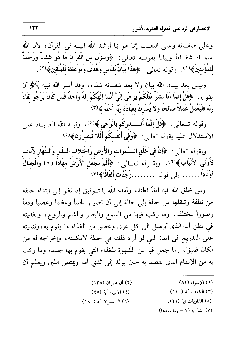 وليس بعد بيان الله بيان ولا بعد شفائه شفاء، وقد أمر الله نبيه - صلى الله عليه وسلم- أن يقول: {قُلْ إِنَّمَا أَنَا بَشَرٌ مِثْلُكُمْ يُوحَى إِلَيَّ أَنَّمَا إِلَهُكُمْ إِلَهٌ وَاحِدٌ فَمَنْ كَانَ يَرْجُوا لِقَاءَ رَبِّهِ فَلْيَعْمَلْ عَمَلاً صَالِحاً وَلا يُشْرِكْ بِعِبَادَةِ رَبِّهِ أَحَداً} 3. وقوله تعالى: {قُلْ إِنَّمَا أُنْذِرُكُمْ بِالْوَحْيِ} 4 ونبه الله العباد على الاستدلال عليه بقوله تعالى: {وَفِي أَنْفُسِكُمْ أَفَلا تُبْصِرُونَ} 5. وبقوله تعالى: {إِنَّ فِي خَلْقِ السَّمَاوَاتِ وَالأرْضِ وَاخْتِلافِ اللَّيْلِ وَالنَّهَارِ لآياتٍ لأُولِي الألْبَابِ} 6، وبقوله تعالى: {أَلَمْ نَجْعَلِ الأرْضَ مِهَاداً وَالْجِبَالَ أَوْتَاداً} إلى قوله: {وَجَنَّاتٍ أَلْفَافاً} 7.