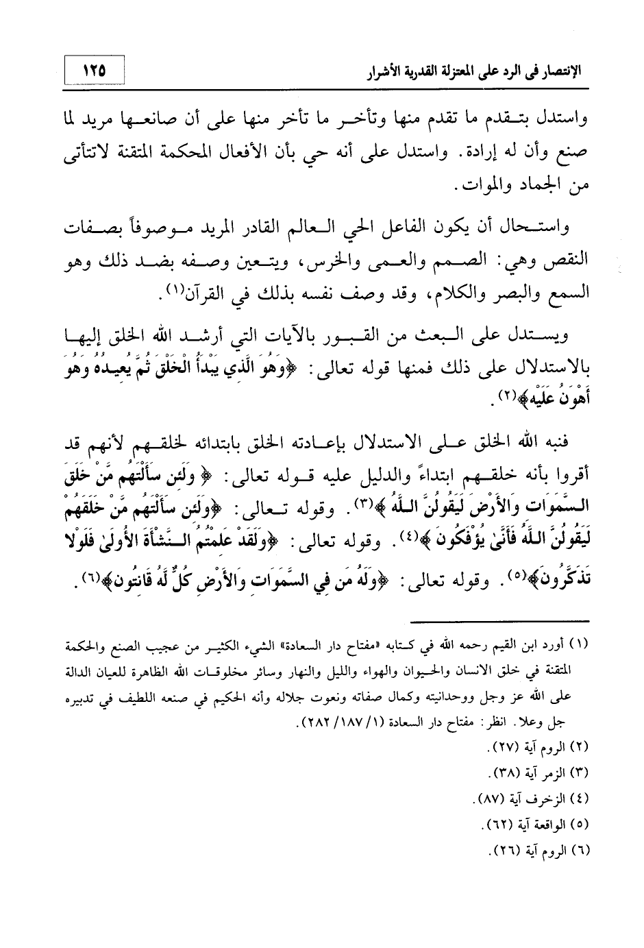 فنبه الله الخلق على الاستدلال بإعادته الخلق بابتدائه لخلقهم لأنهم قد أقروا بأنه خلقهم ابتداءً والدليل عليه قوله تعالى: {وَلَئِنْ سَأَلْتَهُمْ مَنْ خَلَقَ السَّمَاوَاتِ وَالأَرْضَ لَيَقُولُنَّ اللَّهُ} 3 وقوله تعالى: {وَلَئِنْ سَأَلْتَهُمْ مَنْ خَلَقَهُمْ لَيَقُولُنَّ اللَّهُ فَأَنَّى يُؤْفَكُونَ} 4. وقوله تعالى: {وَلَقَدْ عَلِمْتُمُ النَّشْأَةَ الأُولَى فَلَوْلا تَذَكَّرُونَ} 5. وقوله تعالى: {وَلَهُ مَنْ فِي السَّمَاوَاتِ وَالأَرْضِ كُلٌّ لَهُ قَانِتُونَ} 6.