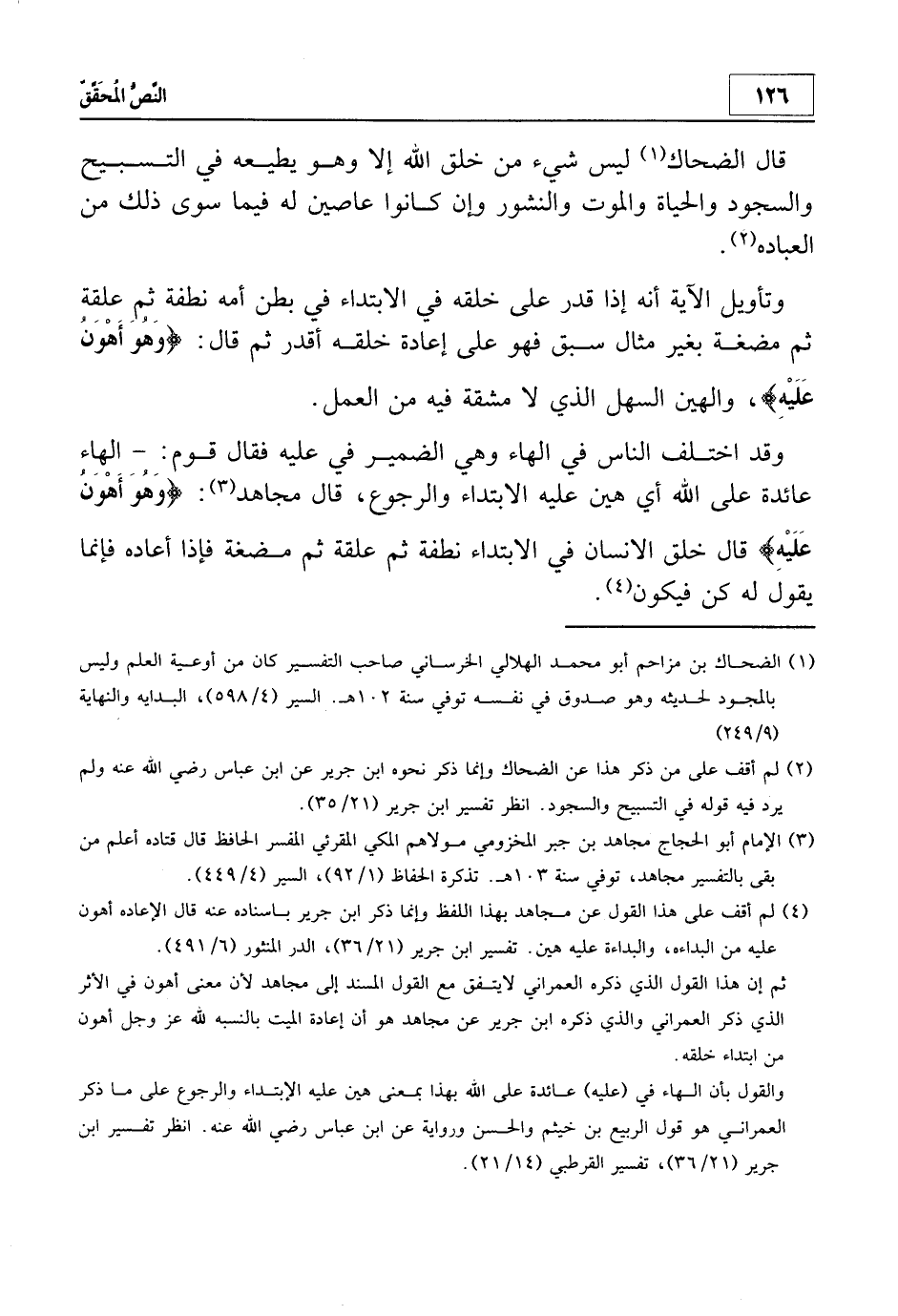 والقول بأن الهاء في (عليه) عائدة على الله بهذا بمعنى هين عليه الابتداء والرجوع على ما ذكر العمراني هو قول الربيع بن خيثم والحسن ورواية عن ابن عباس رضي الله عنه. انظر: تفسير ابن جرير 21/36، تفسير القرطبي 14/21.