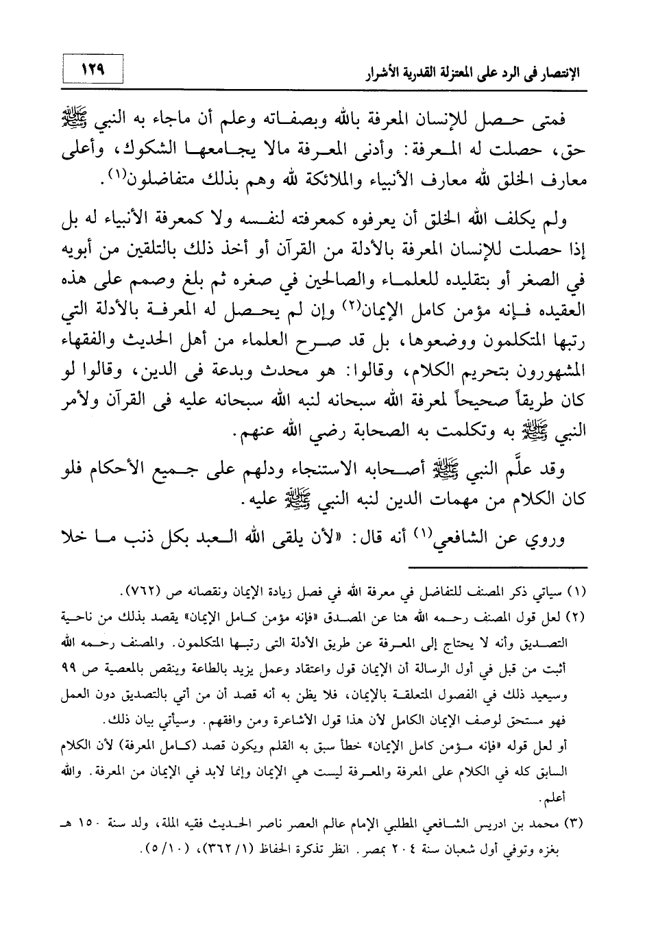 2 لعل قول المصنف هنا عن المصدق "فإنه مؤمن كامل الإيمان" يقصد بذلك من ناحية التصديق وأنه لا يحتاج إلى المعرفة عن طريق الأدلة التي رتبها المتكلمون. والمصنف - رحمه الله - أثبت من قبل في أول الرسالة أن الإيمان قول واعتقاد وعمل يزيد بالطاعة وينقص بالمعصية ص 99، وسيعيد ذلك في الفصول المتعلقة بالإيمان، فلا يظن به أنه قصد أن من أتى بالتصديق دون العمل فهو مستحق لوصف الإيمان الكامل لأن هذا قول الأشاعرة ومن وافقهم. وسيأتي بيان ذلك.