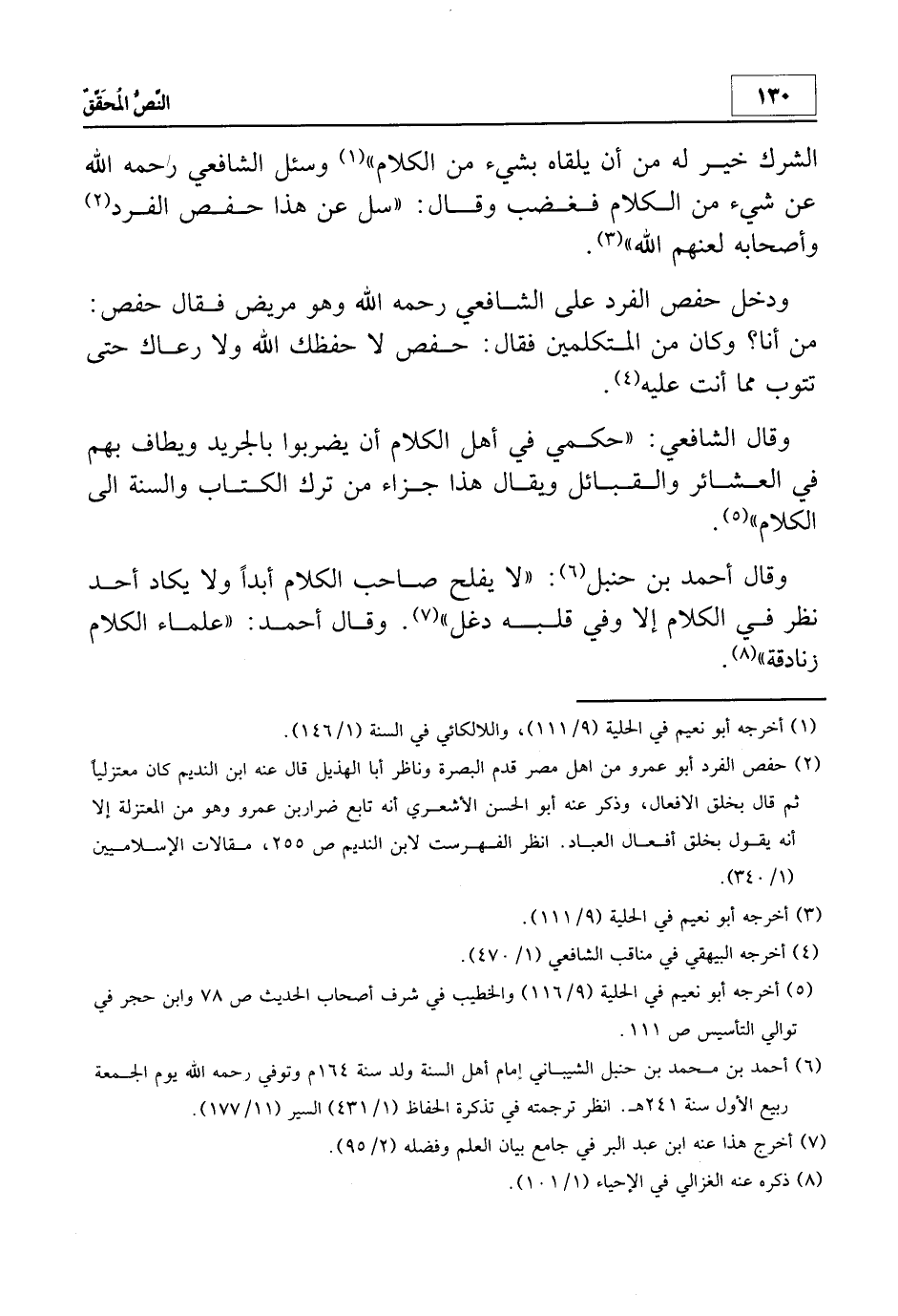 الشرك خير له من أن يلقاه بشيء من الكلام"1 وسئل الشافعي - رحمه الله - عن شيء من الكلام فغضب وقال: "سل عن هذا حفص الفرد 2 وأصحابه لعنهم الله"3.
